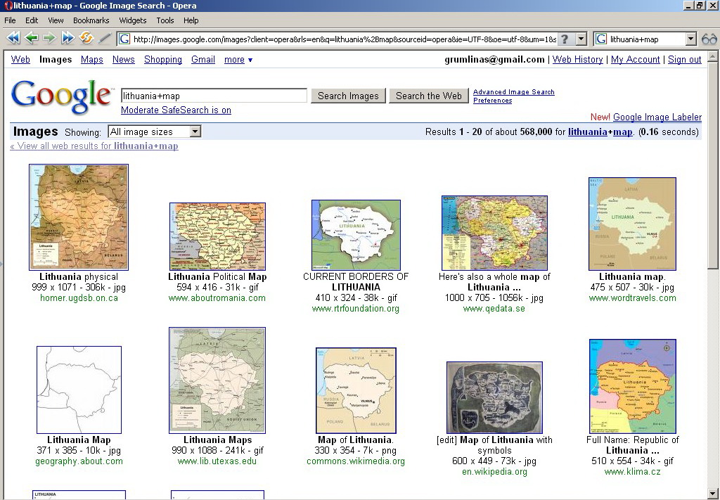 Tačiau tokia tiesioginė paieška gali būti modifikuota ir galime rasti kiek kitokių rezultatų: tarkime, atliekame paiešką lietuva+map ir gauname va tokį rezultatą. Na, ir trečias variantas: paieška lithuania+map ir gauname dar vieną rezultatą.