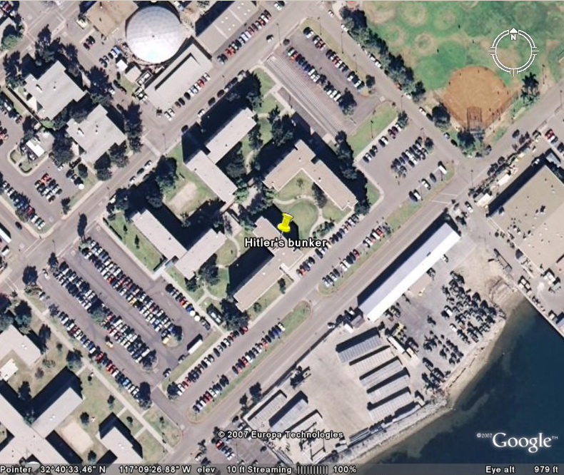 Jei tikėti užrašu, tai yra Hitlerio bunkeris, kur jis, ko gero, sau ramiai rašė memuarus. Deja, deja, tai yra JAV „Ruonių“ (spec.paskirties karinio jūrų laivynio padalinių) buveinė Bougainville Road, US Navy Exchange, San Diego 😀