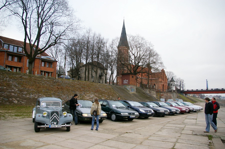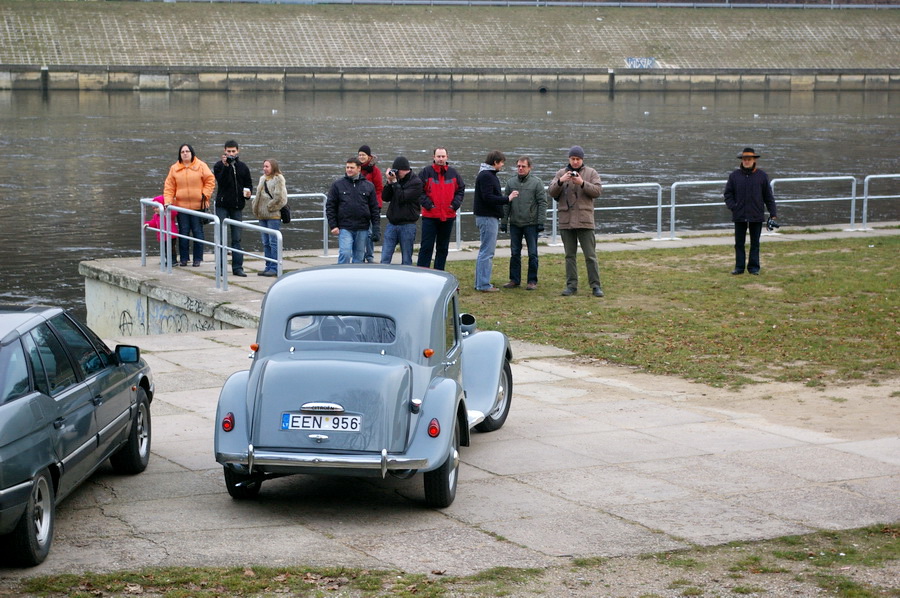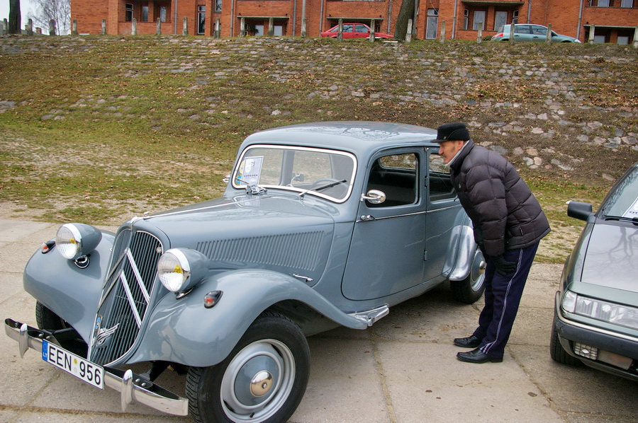 Šiandien sudalyvavau nedideliame citrofanų sambūrėlyje. Kadangi šiemet sukanka 75 metai nuo Traction Avant pasirodymo, Prancūzijos trakcionistai nutarė šį įvykį pažymėti fotosesija, kai sutartą dieną visi trakcionistai nusifotografuoja prie savo automobilių, papuoštų specialiu plakatėliu. Nors Lietuvoje trakcionų labai jau nedaug, bet „Citrinos“ klubas irgi nutarė sudalyvauti šiame renginuke. Susirinkome prie pono Valdemaro namų ir nuvažiavome į Nemuno krantinę prie Vytauto bažnyčios. Fotosesija gavosi gera, pabendravome mažumėlę apie ūkį, gyvenimą ir citroenus. Pabaigai gavosi siurprizas – iš Vytauto bažnyčios išėjęs kunigas pradėjo šventinti prie mūsų rikiuotės galo prisišliejusius kažkokius golpelius ir mersus. Bet – sykį pradėjęs, negali sustoti – praėjo jis ir pro mūsų awto rikiuotę ir taip pat pašventino. Taip netyčia mūsų citrošrotui gavosi gėris 😉