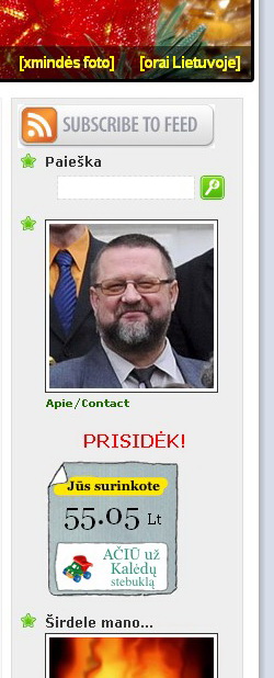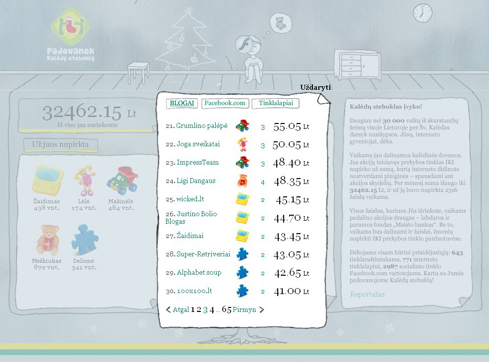 Šįryt gavau iš kaledustebuklas.lt elektroninį laišką, kuriuo dėkojama už mano paramą skurstančių šeimų vaikams. Laiškas tikrai gražus, bet ne visai tuo adresu – juk be Jūsų, kurie kantriai maigė puslapio dešinėje esantį reklaminį skydelį ir taip prisidėjote prie akcijos – nekas būtų teįvykę. 1101 kartą paspaustas skydelis – ir kaskart iš UAB „Palink“ (kuri valdo IKI prekybos centrų tinklą ir organizavo šį vyksmą) pelno buvo atskaičiuojami 5 centai. Regis, kas čia tėra, tie 5 centai. Tačiau centas prie cento – ir surinkome 55.05Lt, kurie įsiliejo į gražią 32462.15Lt sumą.