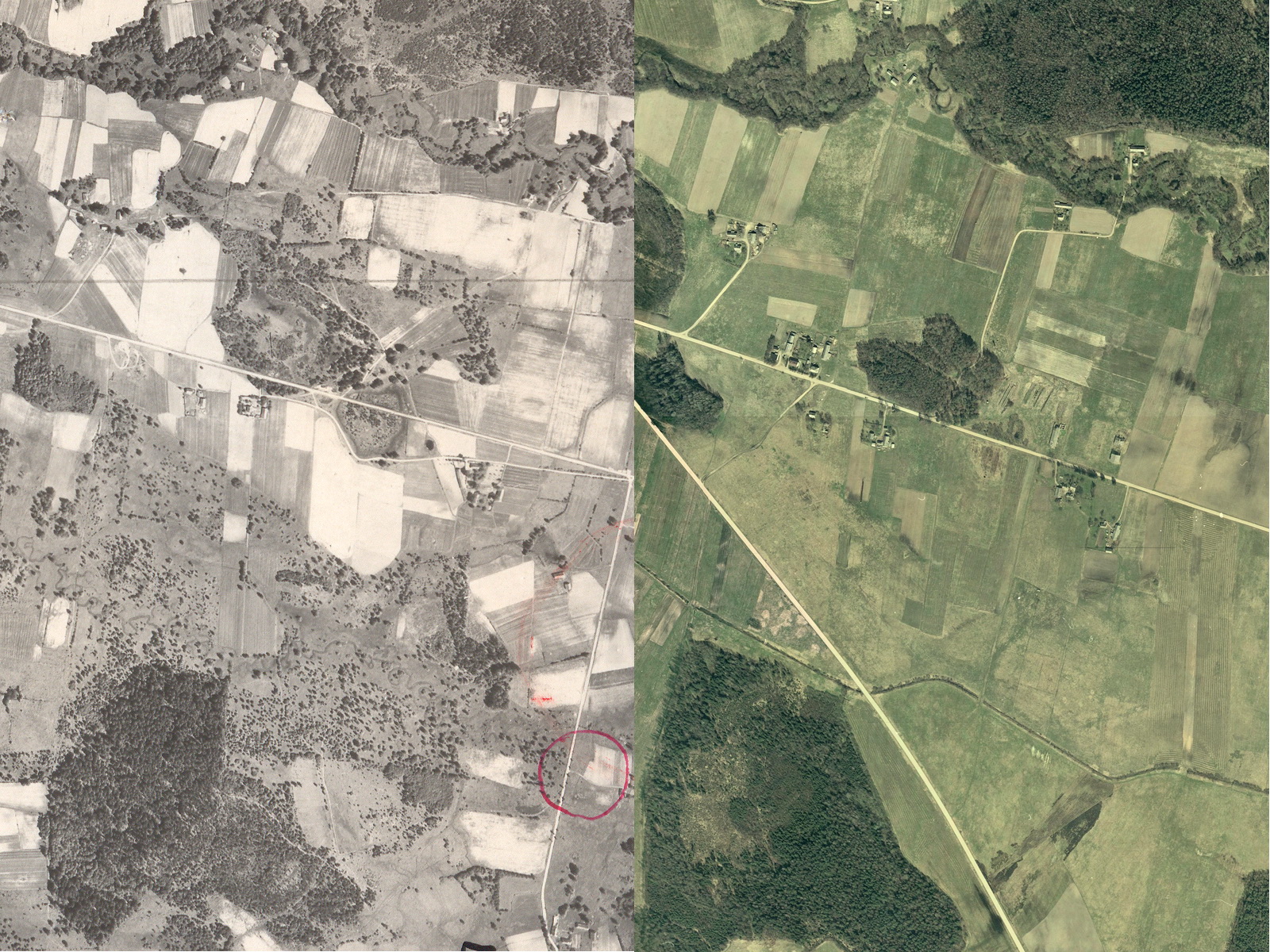Taigi, prisiminęs, kad mūsų institute lygtai yra išlikusios 1949-1952 metais atiliktos Lietuvos aerofotonuotraukos fragmentų, nuėjau archyvan ir atradau vieną vienintelę savo vaikystės pustoninę kaimo aerofotonuotrauką, atliktą 1952-06-23. Laimei, joje buvo atžymos apie tam tikrus geodezinius taškus, tad ta nuotrauka išliko (nuotraukos be atžymų kadaise buvo sunaikintos). Nusiskenavau, tad galima ją palyginti su 2005 metų spalvota aerofotonuotrauka. Pakitimai stulbinantys, ir aišku, kad gamtos nebeliko, o tik sukultūrintas landšaftas. Nors, kai teko pro tas vietas pravažiuoti, nebevalomi melioracijos grioviai pradeda užželti krūmais ir medžiais, žolių šaknys greit užkimš drenažą, tad po kažkiek laiko pamažu, bet užtikrintai gamta apgydys piktžaizdes, padarytas žmogaus noro turėti daugiau pievų ar auginti daugiau bulvių. Ko, kaip dabar paaiškėjo, niekam visiškai nereikia.