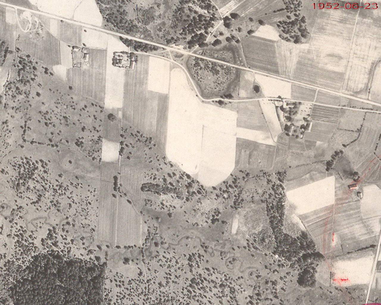1952 (pustoninė) aerofotonuotrauka, kurioje pateiktas padidintas vietovės fragmentas, leidžiantis detaliau įvertinti tuometinę natūralią vietovės būklę – vingiuoti upeliai, nedideli dirbamos žemės sklypai, apsodinti medžiais, daug jauno miško. Paradoksalu tai, kad sugebėjau vizualiai prisiminti beveik visus šioje nuotraukoje matomus su sodyba susijusius objektus, nors man tuomet buvo 4-8 metai, o pati nuotrauka daryta prieš 11-15 metų ir pakitimų yra.