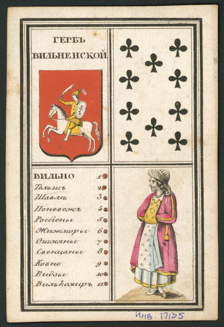 Taigi, tokiame saite su senoviniais piešiniais Vintage Printable (labai rekomenduoju visokių senienų mėgėjams – vintage turto tikrai ten įdomaus yra) radau kažkokį rusišką senobišką kortų/kortelių žaidimą. Ant tų kortų vienos pusės gubernijos schematinis žemėlapis su pažymėtais svarbiausiais miestais, kitoje pusėje kortos reikšmė, gubernijos herbas, nacionaliniu kostiumu aprengtas tos gubernijos gyventojas ir miestų sąrašas su kategorijomis(?). Nežinau, kaip jis buvo žaidžiamas, nes jei tai buvo kortos – labai jau lengva įsiminti reikšmes pagal gubernijas, bet va sudomino Vilniaus gubernijos schemutė – praktiškai visa Lietuva, t.y. žaidimas pagamintas iki 1843 metų, kai tuometinė Vilniaus gubernija buvo perskelta į Vilniaus ir Kauno gubernijas. Garbingo amžiaus žaidimukas.