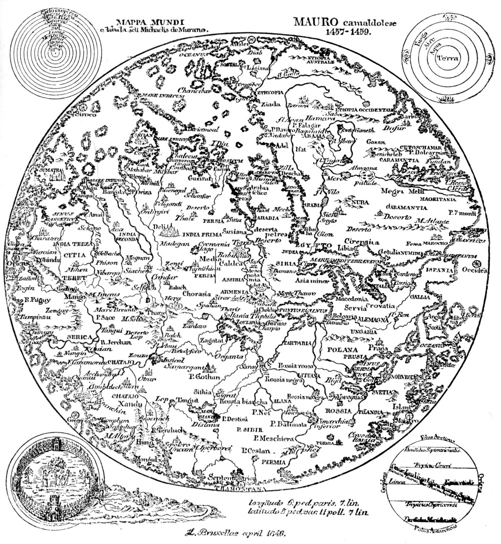 1459 metais Venecijos vienuolis Fra Mauras išbraižė didžiulį apskritą (1 metro skersmens) tuo metu žinomo pasaulio žemėlapį (paimtas iš čia, o čia visas skanas besidomintiems). Lietuvos plote jis pavaizdavo dvi upes ir beveik taisyklingai lotyniškai užrašė krašto pavadinimą: Litvana. Tai turbūt pirmas mums įprasto Lietuvos lotyniško pavadinimo Lithvania variantas. 1894 metais Fra Mauro žemėlapis išleistas vienspalviu variantu, kuriae situacija matoma aiškiau, nei spalvotame. Tik atkreipkite dėmesį, kad situacija pateikta „aukštyn kojomis“. Pageidaujantiems – pilnas skanas, paimtas iš čia.