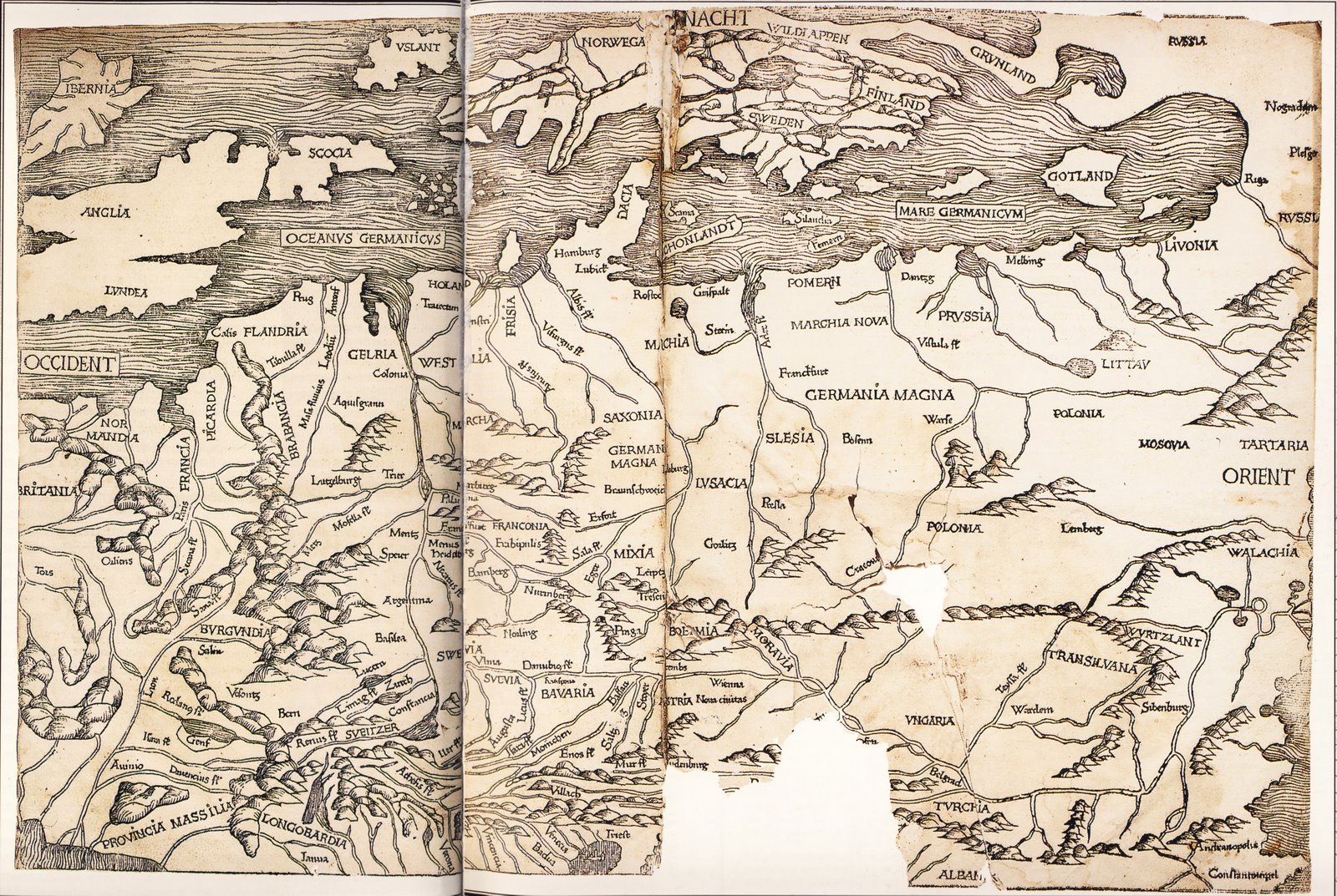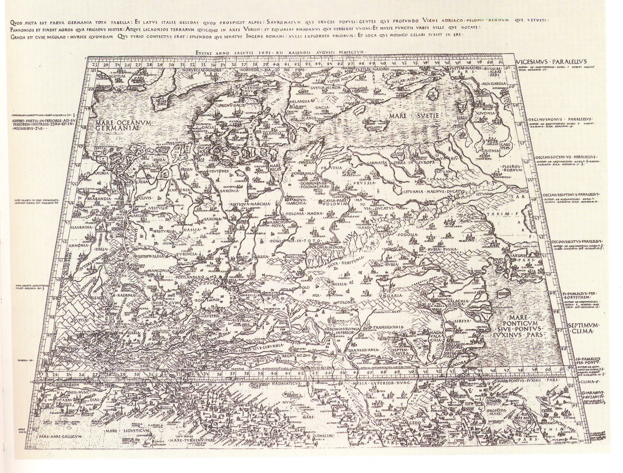 Dar vieną, tikslesnį ir detalesnį žemėlapį – jame buvo vaizduojama tik Vidurio Europa (Sarmatia terra in Evropa) apie 1450 metus sudarė vokiečių vyskupas, labai daug dėmesio skyręs filosofijos, teologijos ir astronomijos mokslams, Nikolajus Kuzietis. Jame matome aibę detalių: Nemuno (Memele flv.), Šventosios (Hillige flv.) ir Ventos (Poller flv.) upes, Klaipėdos (Aremele Castrvm)ir Kauno (Cava) miestus. Kuršių marios (Lacus Avomen) nelabai panašios į save, o kadangi tuo metu visos upės turėjo tekėti iš kalnų – nupiešti pramanyti kalnai Tevca mons. Šis žemėlapis buvo atspausdintas 1491 metais, iškarpa yra iš neypač geros kokybės mano turimo skano (Visas skanas besidomintiems)..