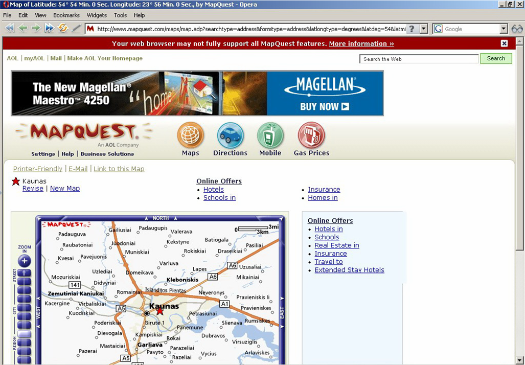 Mažiau populiarus, bet irgi naudotinas atlasas – MapQuest. Čia irgi pasižiūrėkime, kur tas Kaunas. Šis atlasas skirtas daugiau keliaujantiems automobiliais, tad jame yra ir atitinkamos informacijos (netgi apie degalų kainas) jei tokia buvo surinkta.
