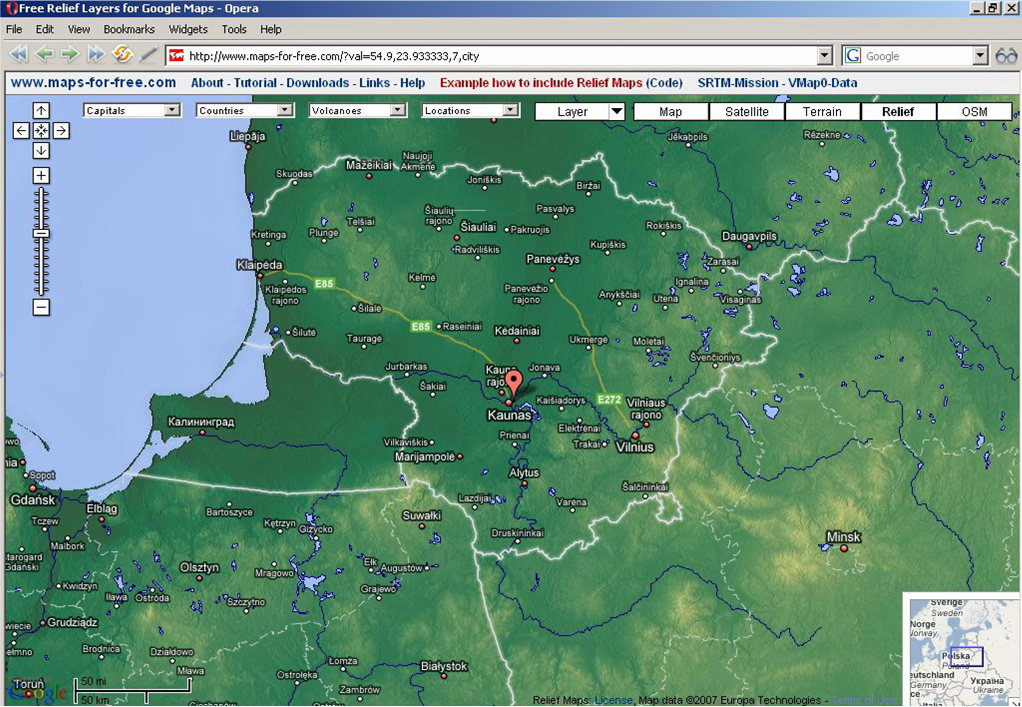 Kažkiek silpnesnis, tačiau irgi vertas aplankyti yra Maps for Free atlasas, kuris specializuojasi gražiame reljefo atvaizdavime. Kauno paieška ir čia davė teigiamus rezultatus.