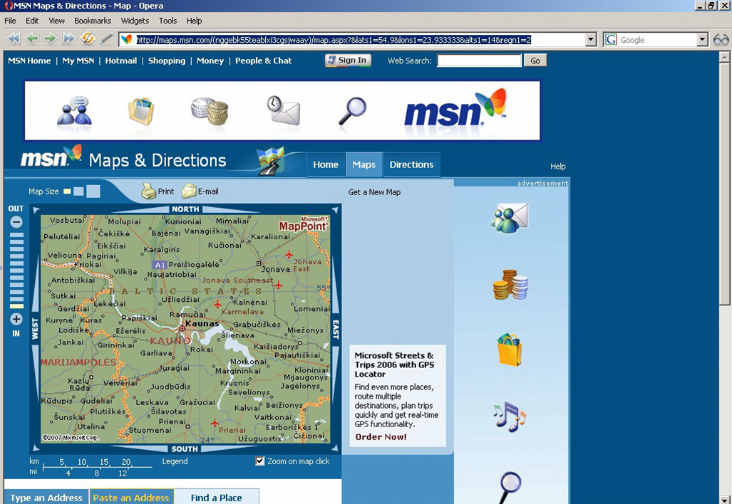 Ne vienas pakeiksnojame firmą MicroSoft (nors ir nenustajame naudotis jos sukurta programine fatware įranga). Ji yra paleidusi keletą internetinių paslaugų, ir viena iš jų yra MicroSoft Encarta Map Center – tikrai geras informacijos šaltinis, sukurtas klasikinio atlaso stiliumi. Kaunas pažymėtas ir šiame atlase.