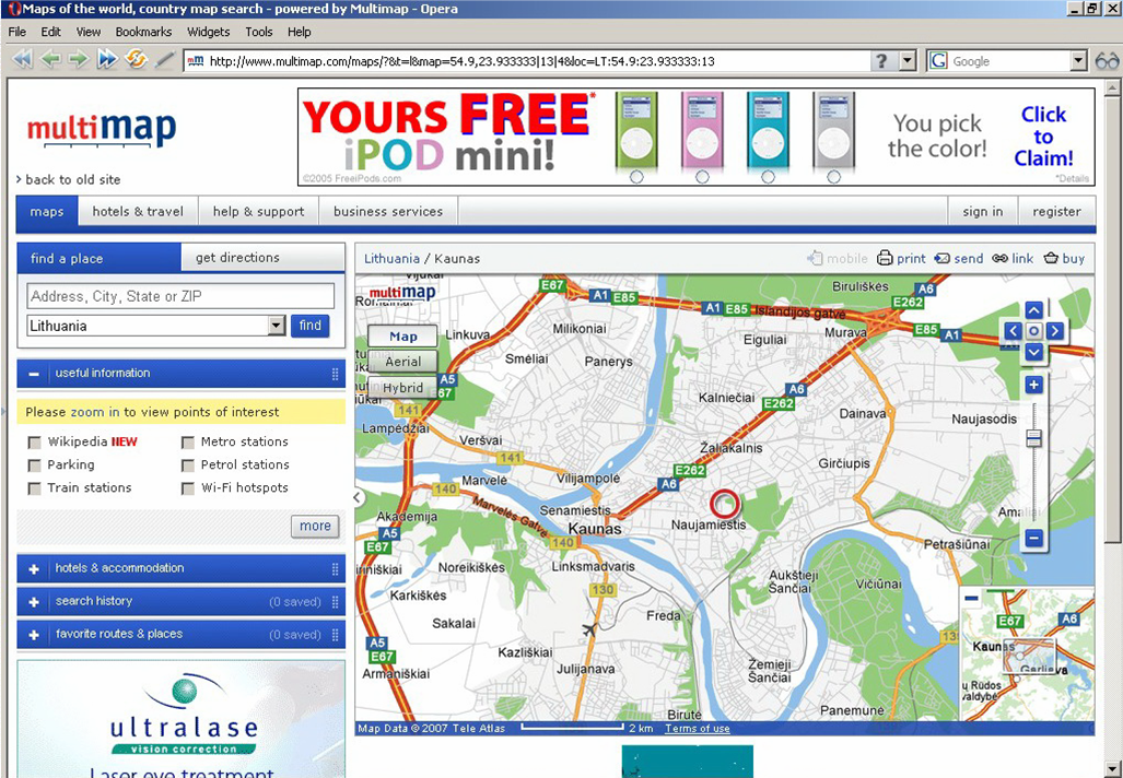 Galbūt pavargome nuo Wikimapia klonų, tačiau supažindinsiu su dar vienu – MultiMap, kuris pateikia gana nablogą Kauno pravažiavimų schemą.