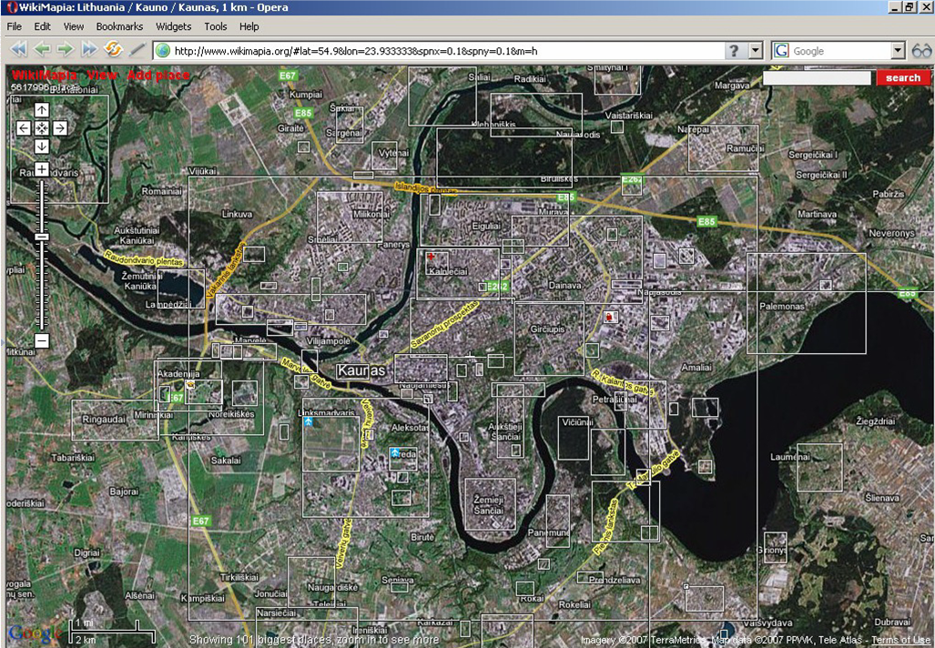 Visi žinome Wikipedia internetinę enciklopediją, tačiau gal ne visi susidūrėme su jos atlasu Wikimapia, kuri irgi panaudojo savo pagrindui kosminius vaizdus, pasiskolintus iš Google. Šiame atlase yra pridėta daug įvairios informacijos, pateiktos naudotojų. Kaunas ir čia nepamirštas.