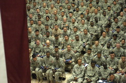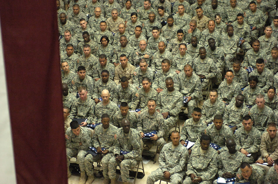 2008-04-12. Kariškiai iš viso Irako susitinka Al Faw rūmuose karinėje Camp Victory stovykloje, kur 259 kariai tapo JAV piliečiais per didžiausią JAV natūralizacijos ceremoniją užjūryje.