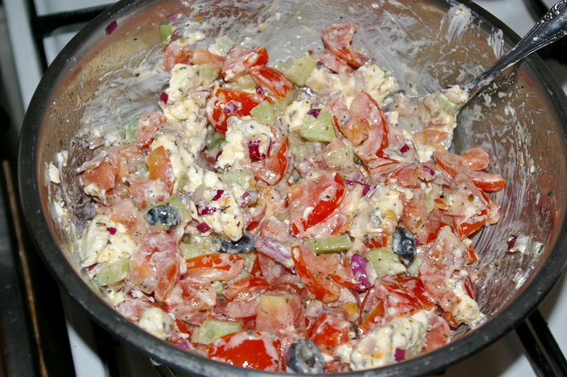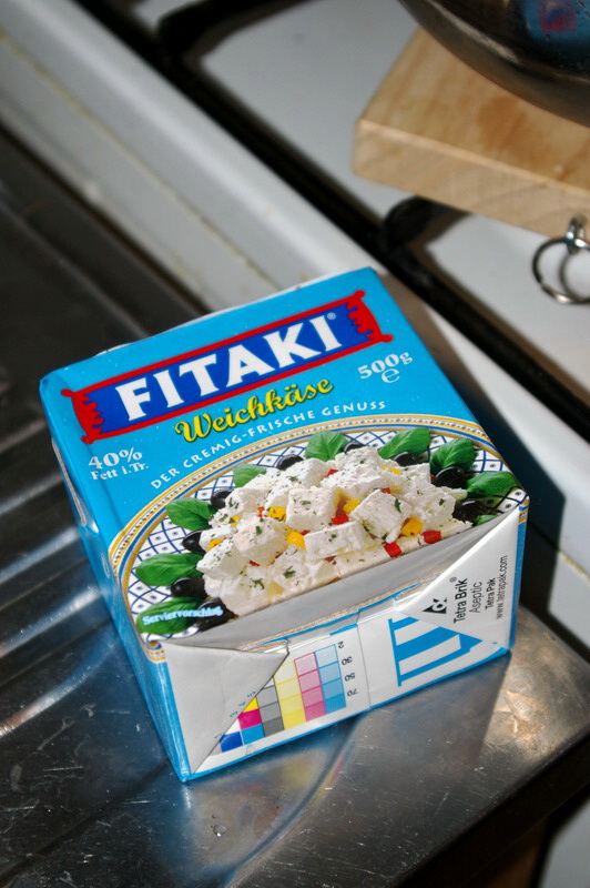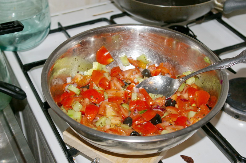Šitas patiekalas mūsų šeimoje jau tradicinis ir labai mėgstamas. Porai žmonių reikia maždaug 6-8 pomidorų (jei finansiškai pajėgūs – rekomenduočiau saują mažiukų ekologiškų pomodorų su natūraliu skoniu), pusės ilgojo agurko (nulupta žieve), vieno vidutinio rausvojo svogūno, maždaug 250g fetos sūrio, juodųjų alyvuogių (pagal skonį). Agurkus, pomidorus, alyvuoges supjaustome, sudedame dubenin. Paskaninti visų pirma rekomenduoju baziliką (džiovintą arba šviežią), beriame kelis gerus žiupsnius. Be to, dar pilu kokį itališkų žolelių/provanso žolelių/salotų prieskonių mišinį – kas po ranka pasitaiko. Druskos nededu, feta ir taip sūroka, bet galima pasiskaninti vėliau. Ant išmaišytų daržovių prieskonių pilu 2-3 šaukštus geresnio alyvuogių aliejaus (paprastai nusiperku per akcijas-atrakcijas; kepimui naudojame tik kukrūzų aliejų iš skardinių), vėlgi gerai išmaišome. Tada iš pakelio knaibome sūriniu peiliu fetą ir dedame į salotas. Skirtingai nei „normalūs“ sūriai, ji labiau panaši į kokį varškės sūrelį – nei atpjausi, nei patarkuosi. Sudėję sūrį, išmaišome. Kadangi sūris toks tižus, tai iš esmės jis apsivolioja, aptirpsta, gaunasi biškį sūrio padažas. Vienžo, maisto estetams tai nepatiktų 😉