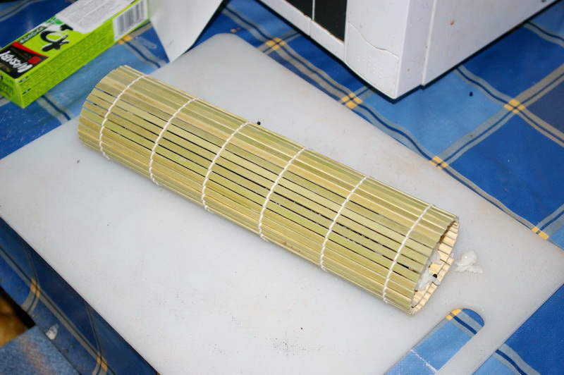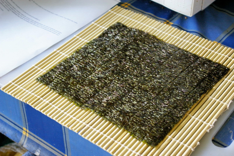 Ketvirtadienį mudu su brangiausiąja nutarėme kada nors pasidaryti suši. Nusipirkome to žalio dumblių popieriaus, spec-ryžių, marinuoto imbiero, krienų pastos, sojų padažo, sūdytos lašišos, juodųjų ikrų ir agurko įdarui. Ir dar tą bambukinį patiesaliuką suvyniojimui.