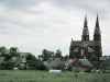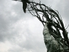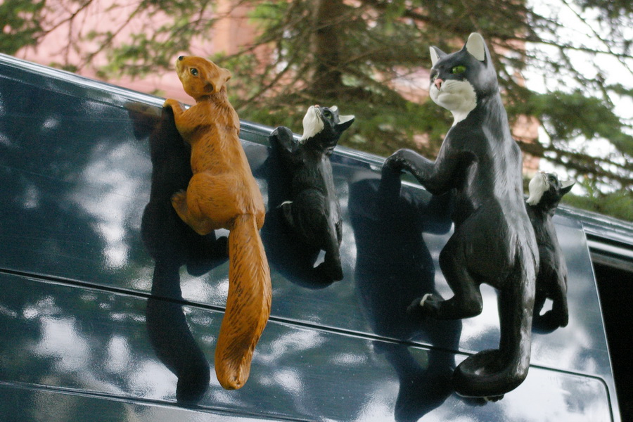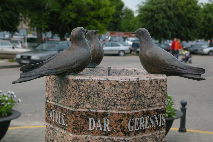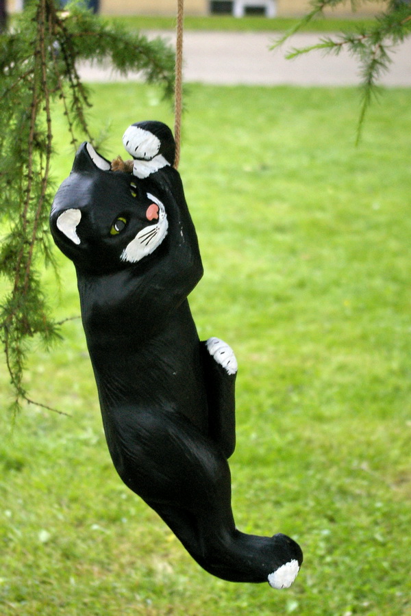 Kadangi ryte apturėjau problemų su mėšlungio sutrauktu ir žiauriai tebeskaudančiu kojos raumeniu, tai, deja, pasivaikščiojimas parke man tuo kaip ir baigėsi. Praeidamas dar nufotkinau kažkokiame sodo papuošimui skirtų niekalų pardavime esančius sintetinius katinukus. Taip pat prasukau pro bažnyčią, užsukau į vidų. Papuošta, bet tamsi ir paslaptinga… Na ir prieš bažnyčią pastatytas įdomus paminkliukas.