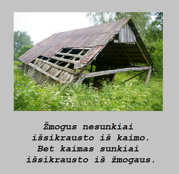 Kiekvienas vis kitaip supranta sąvoka „kaimas“, ypatingai jei tai taikoma norint apibūdinti žmogaus tam tikras savybes. Dažniausiai tai neigiamą atspalvį turintis žodis, o man asmeniškai posakis „…kaimas sunkiai išsikrausto iš žmogaus…“ asocijuojasi su tuo, kad kaimo žmogus masto apie darbą, gamtą, gerus santykius su kaimynu ir t.t. Ir to niekas negali išmušti, net ir išsikėlimas iš jo.
