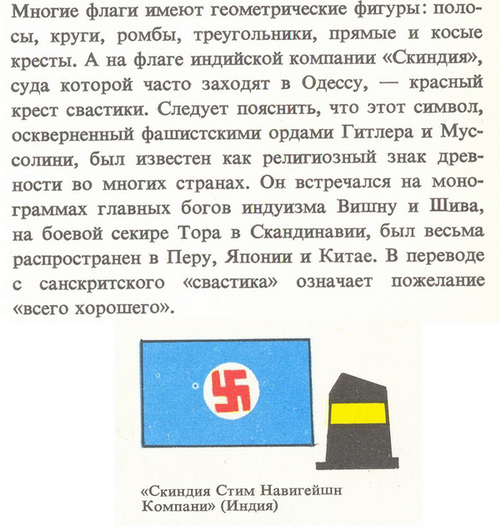 Kitas dalykas, kuris tuomet vėlgi mane šokiravo ir pivertė susimąstyti apie man brukamas idėjas – Indijos laivininkystės kompanijos Scindia Steamship Navigation Company Limited vėliava, kurioje buvo pavaizduota didžiulė raudona svastika. Tuomet mums visiems buvo beatodairiškai skiepijama, jog svastika yra fašistų simbolis ir todėl tai yra BLOGAI. O čia – ir svastika pavaizduota, ir paaiškinta, kad ji tereiškia „Viso geriausiop“. Galva gali sprogti nuo vidinės disharmonijos… Ir turbūt nuo tada vėlgi atsirado vidinis poreikis išsiaiškinti iki galo, kas slypi po terminais ir žodžiais. Ir taip pamažu paaiškėjo, kad Vokietijoje jokių fašistų nebuvo, o buvo nacistai; fašistai gi buvo Italijoje; kad svastika iki šiol tebėra naudojama Azijoje kaip šventas simbolis ir visiškai nesiejama su jokiu blogiu… Šiandien visa tai gali atrasti (jei tik nori atrasti ir nebijai atrasti) internetuose, tačiau tuomet tai reiškė valandas Respublikinėje bibliotekoje, savarankišką lenkų kalbos išmokimą ir t.t.