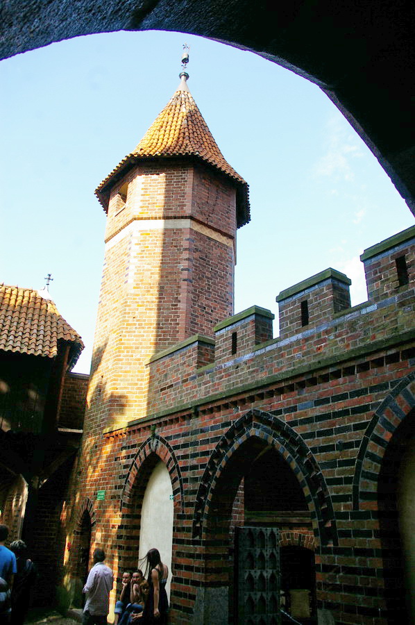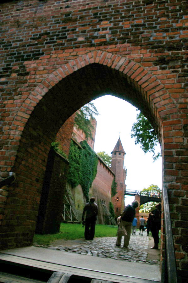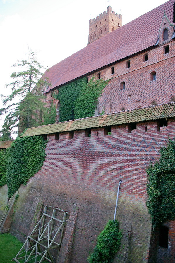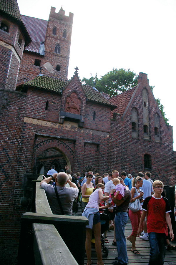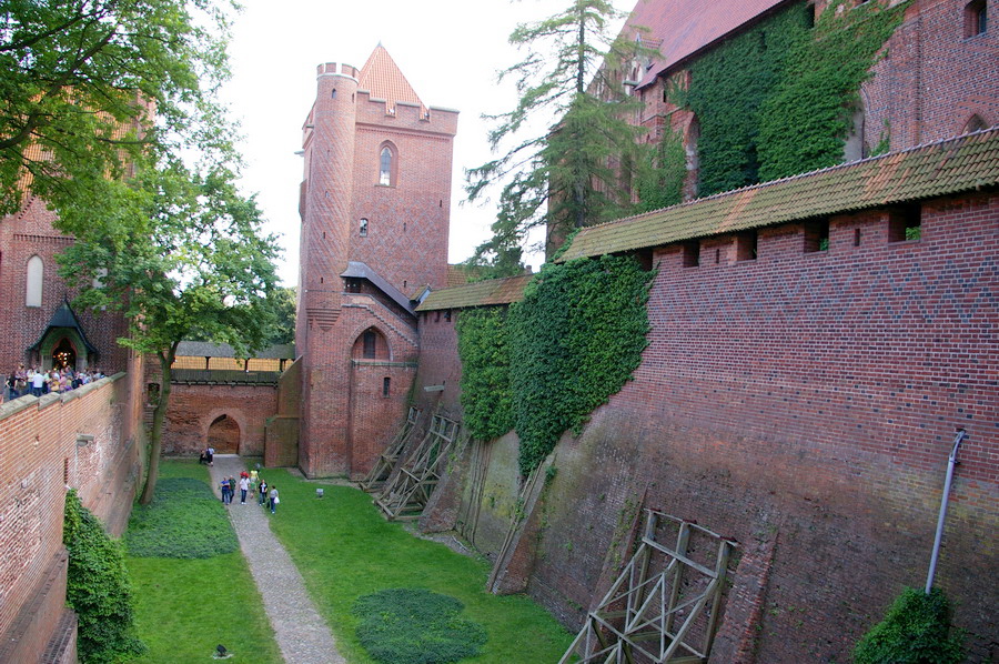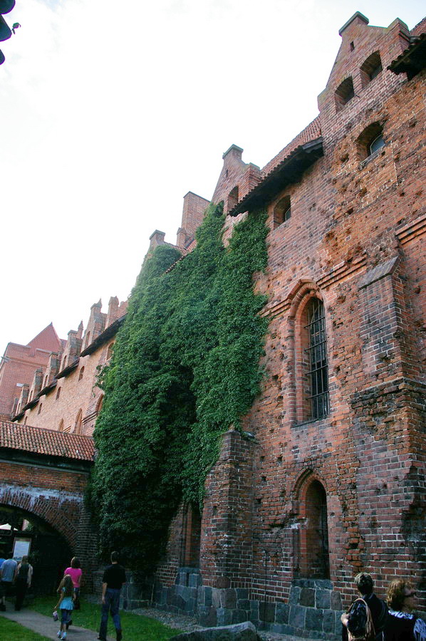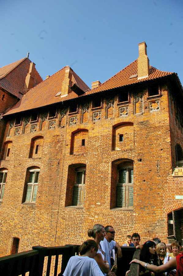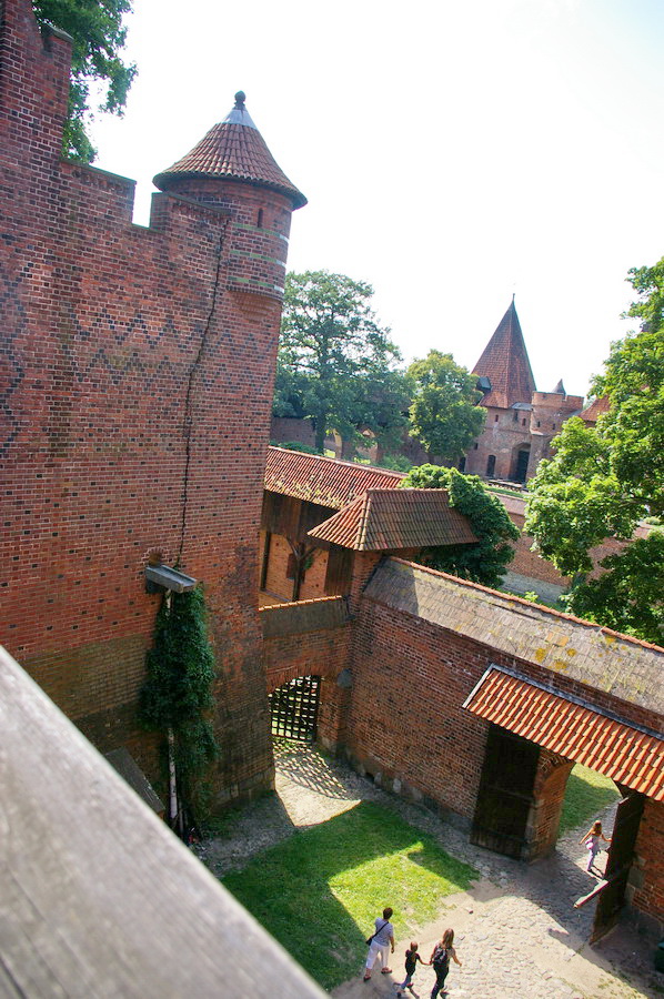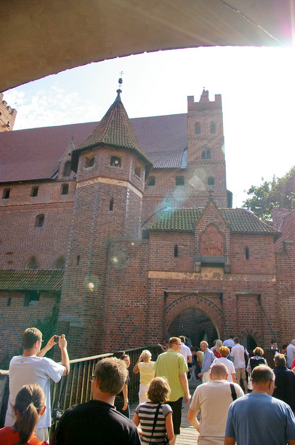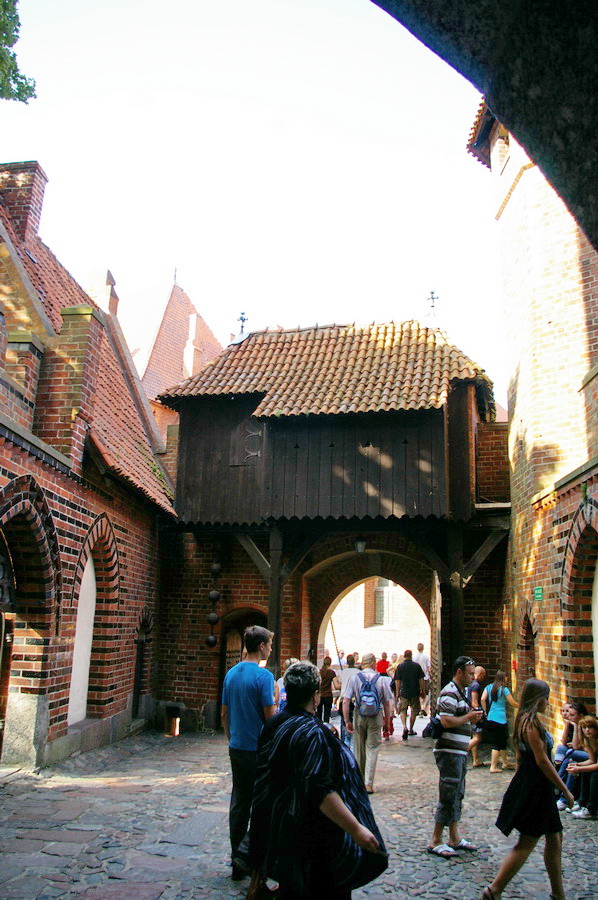 Belaukiant eksursijos tęsinio, pafotkinau Aukštutinę pilį. Tai geriausiai išsilaikiusi ir labiausiai retauruota Malborko pilies dalis, tačiau ten irgi dar yra ką daryti. Susirinkus eksursijai, mediniu tiltu nuėjome į vidų. Prieš vartus mums papasakojo, kad čia iš esmės buvo vyrų vienuolynas, į kurį moterims įeiti buvo uždrausta. Brolių-vienuolių nebūdavo daug (maks. 100-120), tačiau jie surinkdavo didžiules kariuomenes iš visos Europos žygiams prieš pagonis. Vartų bokšto viršuje yra anga, pro kurią pildavo karštą smalą arba vandenį, nors to niekad neprisireikė – pilis niekad nebuvo užimta.