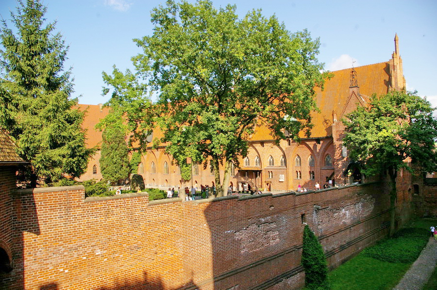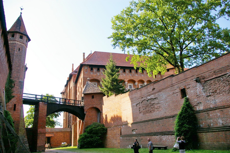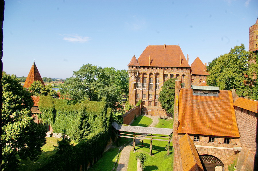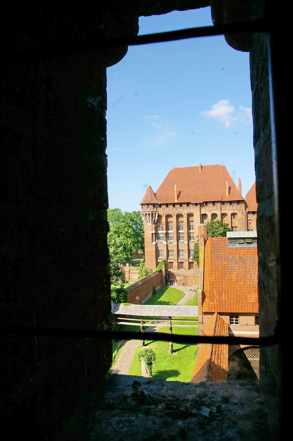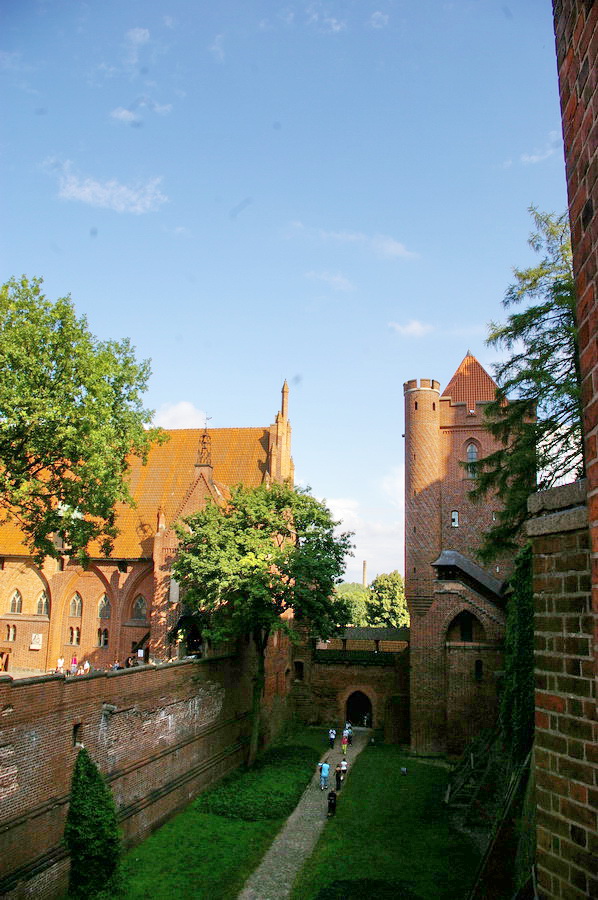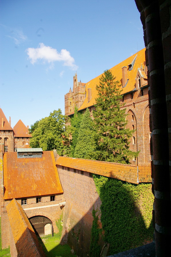 Apžiūrėjus dar keletą mažesnių patalpų, eksursija buvo baigta ir mes galėjome vėl išeiti pro Aukštutinės pilies vartus, pereiti Vidurinės pilies kiemą, kur stovi paminklas žymiausiems Vokiečių ordino didiesiems magistrams. Išėjus pro Vidurinės pilies vartus (pro mažuosius vartelius nelindome 😉 ) turėjome apeiti visą Vidurinę pilį tarp jos sienų ir papildomų įtvirtinimų. Buvo proga pažvelgti į tiltą tarp Vidurinės ir Aukštutinės pilių.