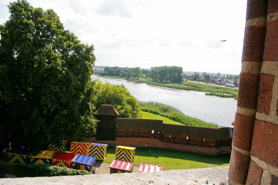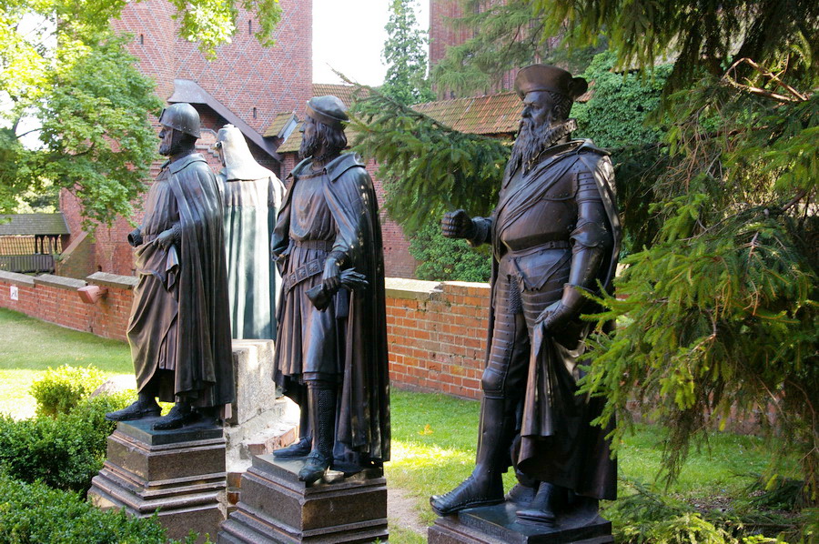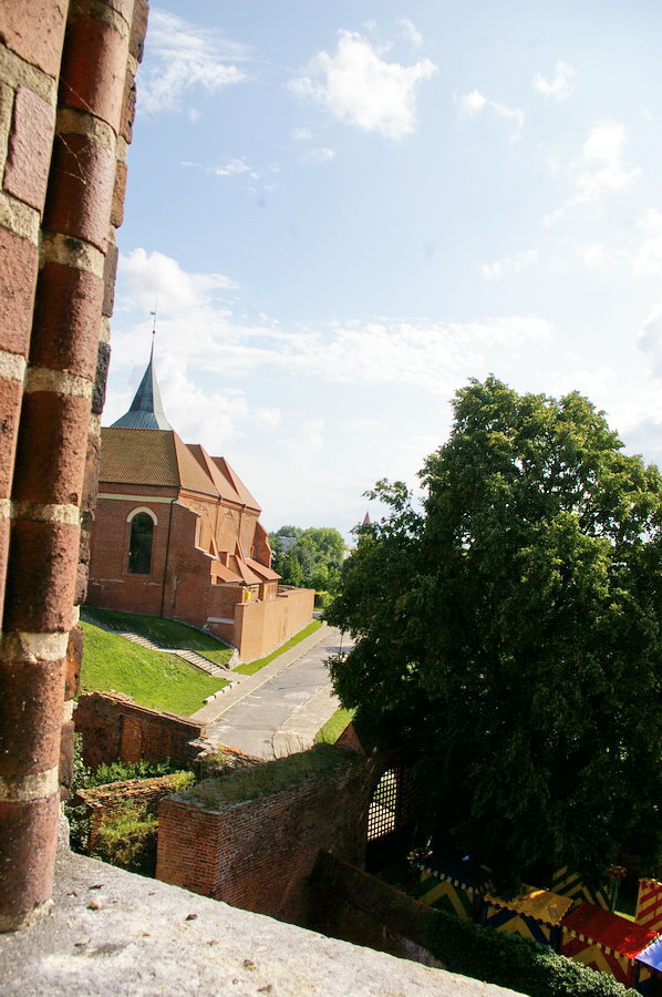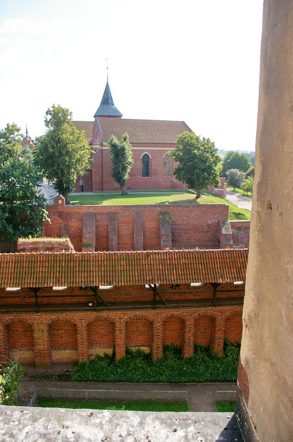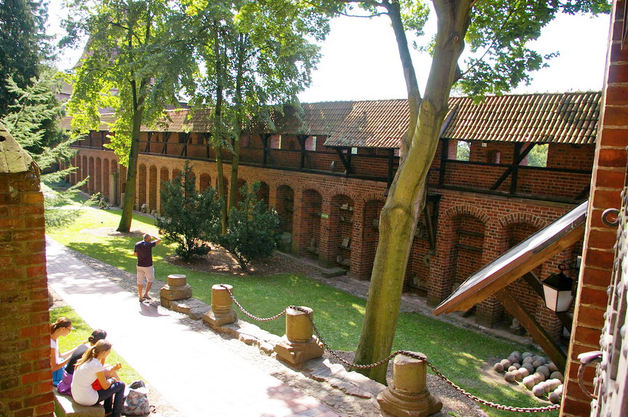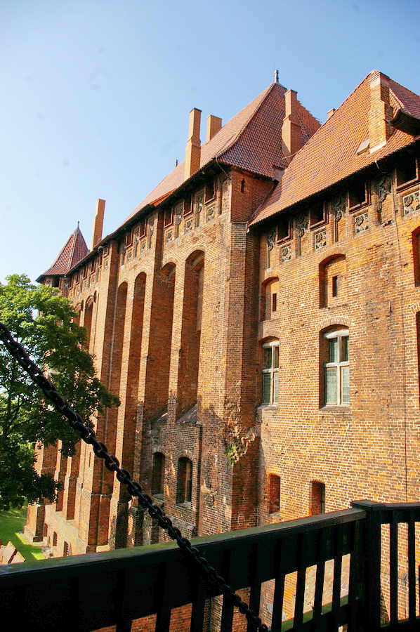 Apžiūrėjus dar keletą mažesnių patalpų, eksursija buvo baigta ir mes galėjome vėl išeiti pro Aukštutinės pilies vartus, pereiti Vidurinės pilies kiemą, kur stovi paminklas žymiausiems Vokiečių ordino didiesiems magistrams. Išėjus pro Vidurinės pilies vartus (pro mažuosius vartelius nelindome 😉 ) turėjome apeiti visą Vidurinę pilį tarp jos sienų ir papildomų įtvirtinimų. Buvo proga pažvelgti į tiltą tarp Vidurinės ir Aukštutinės pilių.