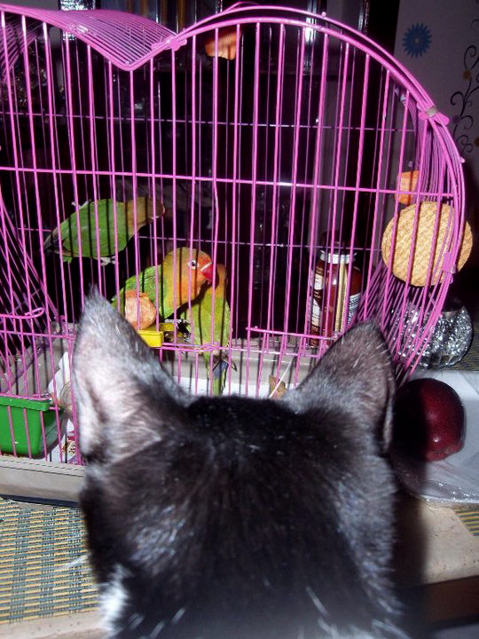 Dukra gavo dovanų tris papūgas narvelyje. Labiausiai tuo susidomėjo (ir iki šiol tebesidomi) katinas Tomis.