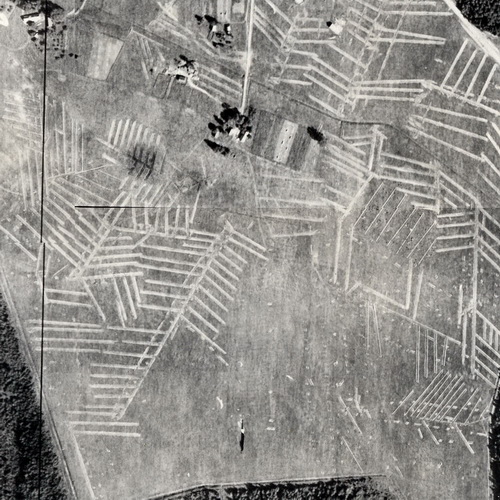 Taip sovietmečiu atrodė laukų drenažo sistemų statyba: šviesios linijos, išsidėsčiuios „eglute“ – tai grioviai, į kuriuos bus pakloti moliniai drenažo vamzdeliai