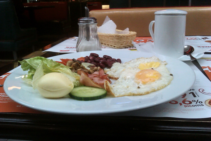 O, geras. Niekur puikesnios angliškos kiaušinienės, kaip pas vokiečius, nesu aptikęs… Mmm, ir kaip jie taip moka pakepinti bekonieną? O fotkėj tas daiktas, baltas ir beveik apvalus, kas? Anyway, skanaus, nors ir po fakto…