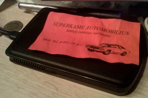 Man Maximos kieme buvo tokį užkišę… Na, pasišaipiau ir tiek: galvojau, durneliai siaučia. O paskui žiūriu: toks pat popieruks užkištas ir ant šalia stovinčios Meganės, ir ant kraislioro 300, ir netgi ant apyšviežio P407. Tada supratau: čia ne durneliai; čia viarslas. Duoda tau vizitkę patys pirmieji; kad sudaužęs bolidą išsyk žinotum kur kreiptis 🙂