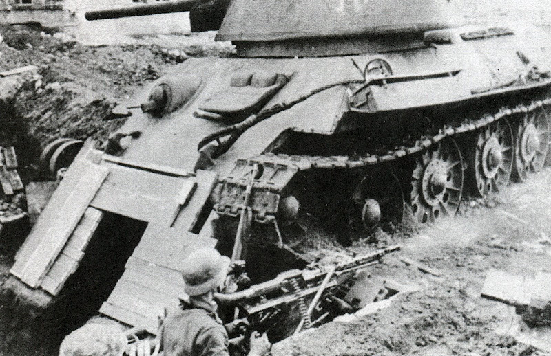 Improvizuotas vokiečių blindažas prie kulkosvydžio MG-4234 pozicijos, panaudojant pamuštą sovietinį T-34-76.