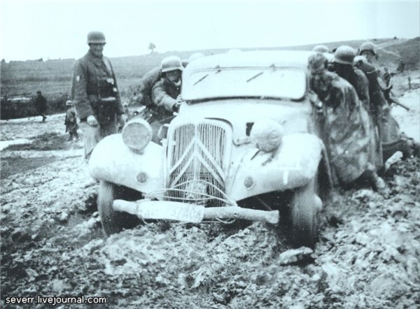 LJe radau puikią fotkę, kurioje vaizduojamas Traction Avant, 1943m. užstrigęs purvynuose kažkur Baltarusijos platybėse. Jis priklausė Prancūzų savanoriškam antibolševikinama legionui (Légion des Volontaires Français contre le Bolchévisme), pustrečio tūkstančio kraštutinių kolaboracionistų grupuotei, kuri vaikėsi sovietinius partizanus Ukrainoje.