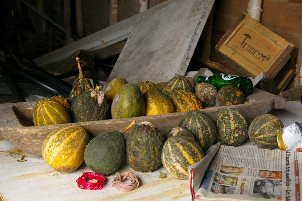 Kadras be jokios aranžuotės, prosto sename klojime ant stalo sudėti daiktai