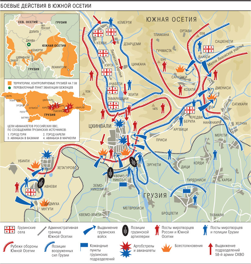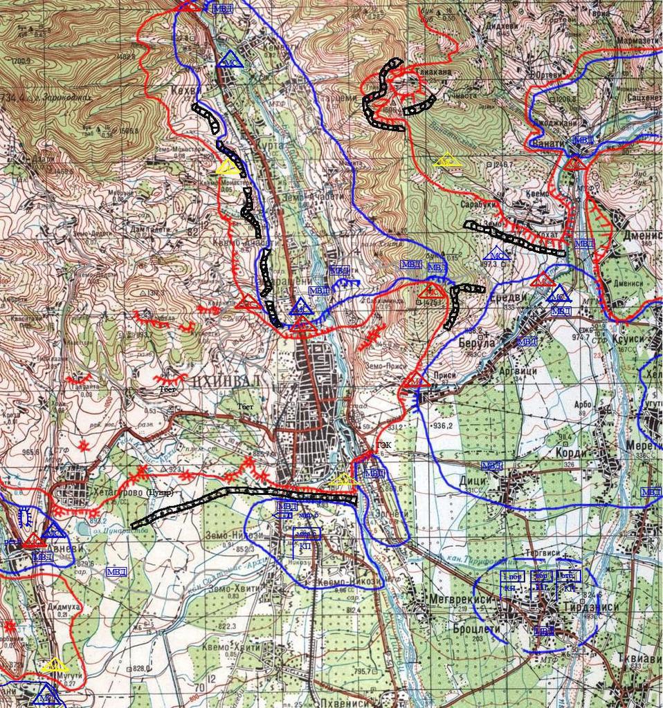 Žvelgiant į pajėgų dislokacijos ir kovos veiksmų žemėlapius, šiek tiek paaiškėja, kas ir kaip ten virė tuos ilgus metus: P.Osetijoje išsibarstę kaimai yra daugmaž vienalyčiai nacionaliniu požiūriu. Cchinvalis gi apsuptas aukštumose išsidėsčiusių gruzinų kaimų, iš kurių ir vyko tiek jo, tiek į osetinų kaimus nutiestų apvažiuojamųjų kelių apšaudymas, t.y. matome klasikinį apgulties scenarijų. Savo ruožtu osetinai siekė sunaikinti šiuose kaimuose išdėstytus gruzinų ugnies taškus, kad likviduoti Cchinvalio apgultį.