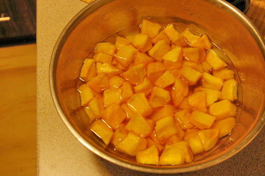 Taigi, deserto valgymo išvakarėse 😉 jamam gerą gabalą moliūgo ir iš vidaus kruopščiai išvalome visas sėklas su plaušais. Šiaip sėklas galima atskirti nuo plaušų ir pasikepinti. Tada atsargiai aštriu peiliu nupjaustome žievę. Atsargiai todėl, kad ta žievė kieta ir, slystelėjus peiliui, galima susižaloti. Nuvalytą moliūgą supjaustome maždaug pusės nykščio didumo gabaliukais ir suberiame į bliūdą. Beriame gerą saują, užpilame keletą šaukštų cukraus, išmaišome taip, kad gabaliukai apsivoliotų cukruje. Taip porcijomis supilame visus gabaliukus ir apvoliojame juos cukrumi. Tada paliekame bliūdą parai ant stalo ar kur kitur kambario temperatūroje. Jei kažkaip įeiname į virtuvę – pamaišome visą šitą grožį ir gana greit pamatysime, kad iš atrodytų sauso moliūgo išsiskiria skystis, kurio prisirinks nemažai.