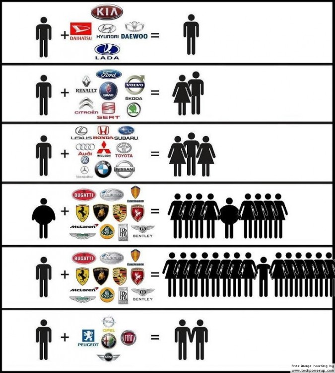 Matematiškai čia bardakėlis paliktas. Abiejose lygybės pusėse palikta po vienodą dėmenį. Išbraukom, sutvarkom. Lada & Co = 0. Logiška. Renault &Co = Moteris. Irgi logiška, tik Volvo buvimas čia glumina. BMW, VW = net dviem moteriškoms, gal blondėms – jei pagal IQ. Porsche , lambo ir Co = daug moteriškų… hmmm. Nu ir paskutinė eilutė – automobilis = vyras. Hmmm, keistai čia markių pririnkta, bet tebūnie. 😀