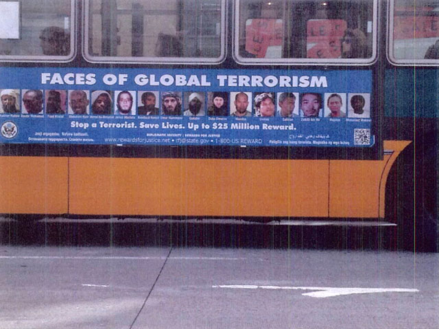 The ads feature pictures of 16 men wanted around the globe for terrorist activities below the words: “Faces of Global Terrorism.”
