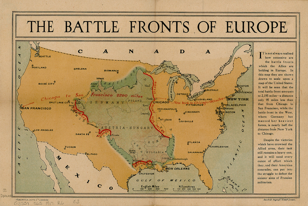 Užkliuvo mano ciekawa akis internetuose už vieno žemėlapio, kuriame amerikonams akivaizdžiai pademonstruota 1PK laikų frontų apimtis, uždedant Europos fragmentą ant JAV.