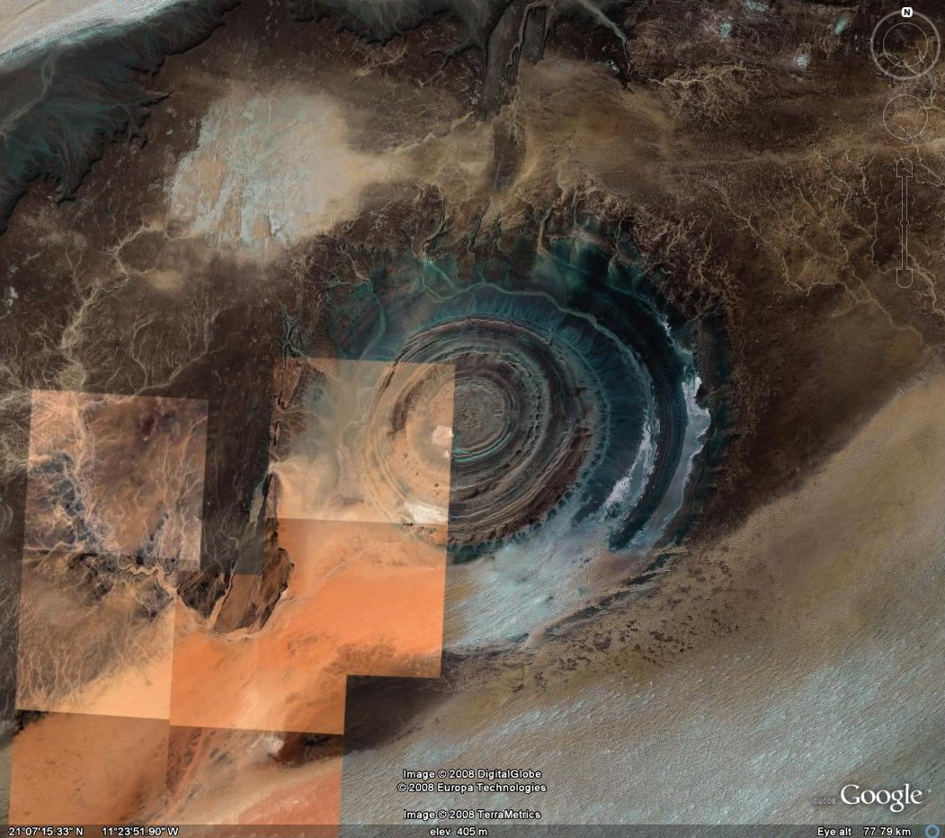 Besiblaškant po pasaulį Google Earth pagalba, akis užkliuvo už labai keisto vaizdo – milžiniški koncentriški apskritimai dykumoje, tarsi milžiniška akis, žvelgianti į kosmosą. Pasirodo, tai Richat (Rišat) struktūra, susidariusi (pagal naujausius tyrinėjimus) iš erodavusio kristalinio kupolo.