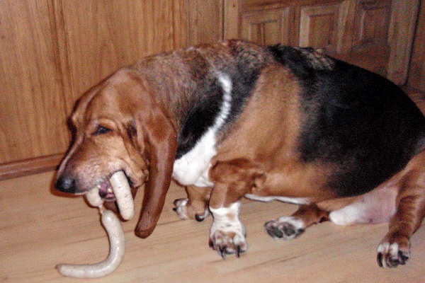 Basset-haundą esi kada gyvą matęs? Veislinio basset-haundo patinas sveria iki 60kg – iš esmės tai dogas nupjautomis kojomis. Mūsiškio tėvas buvo būtent toks. Tik mūsiškis tesveria 40kg (kadaise svėrė iki 46kg), o ilgis nuo nosies galiuko iki uodegos galiuko kažkur 1,5m. Jų būtent tokia STAMBI kondicija yra.