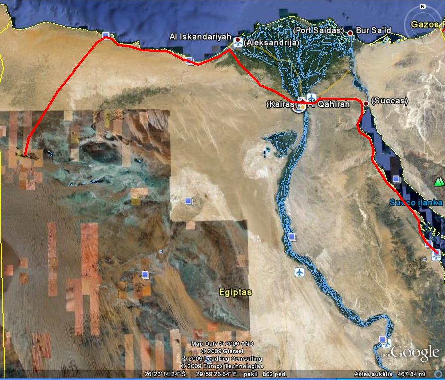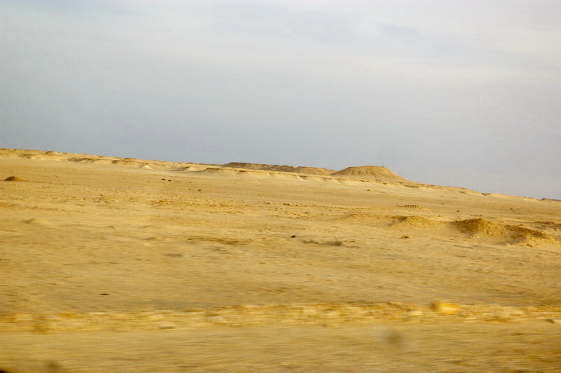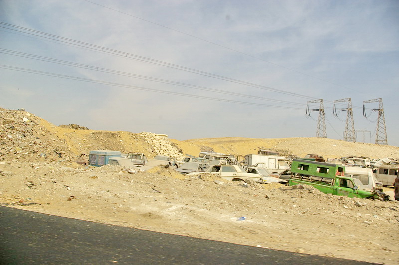 Pasukdami kelio link Aleksandrijos link, per Kairo smogą pastebėjome vieną iš Gizos piramidžių. Gizos todėl, kad nors Kairas daugeliui asocijuojasi su piramidėmis, didžiosios pirmaidės iš tikrųjų yra Gizoje, kur net automobilių registracija skirtinga nuo Kairo 😉 Be abejo piramidžių primėtytas pilnas Egiptas. Ir, jau išvažiuojant iš Kairo, kelio dešinėje yra didžiulis autolaužynas, kuriame klasikinių automobilių mėgėjai turbūt rastų ne vieną dream-car. Tuo tarpu tuos awto, iš kurių rakinėjamos detalės, pamažu užpila smėliu, kad paruošti aikštelę statyboms (ir neklauskite manęs, kas per statybos ant tokio pagrindo – nežinau!)
