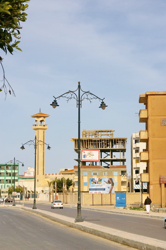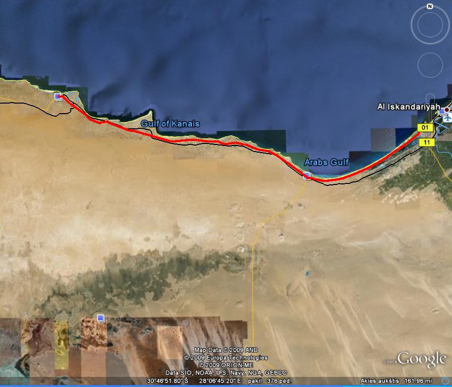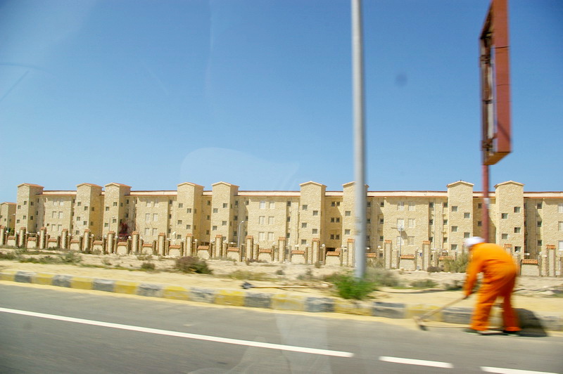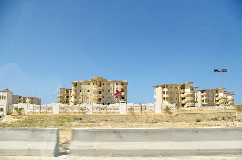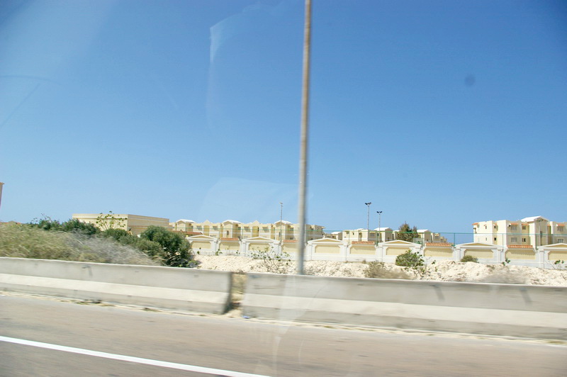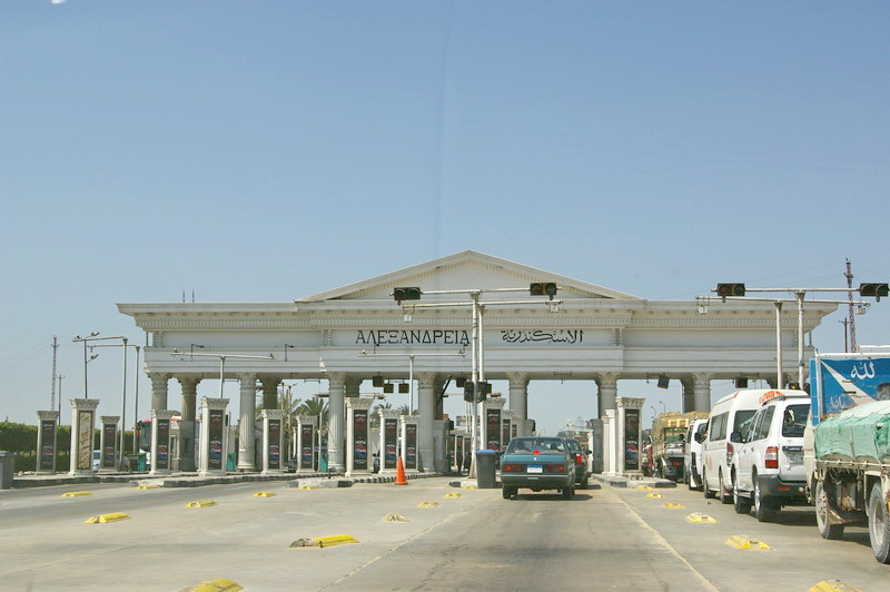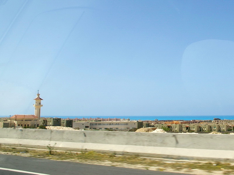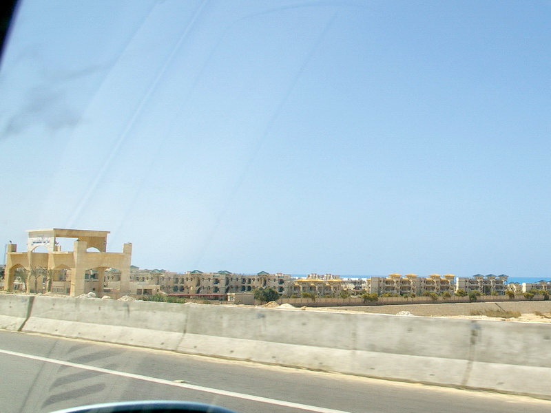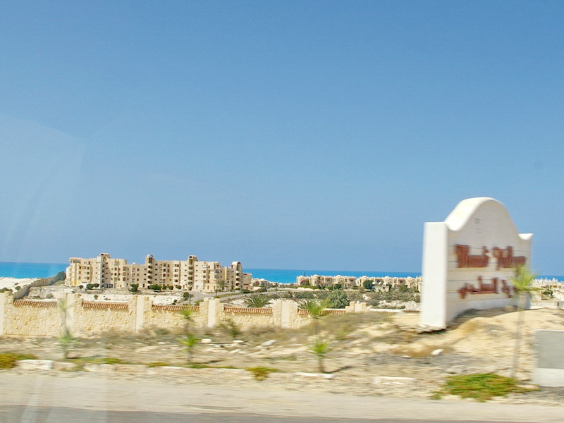 Pasiekus Aleksandrijos pakraščius, iš apmokamos autostrados išvažiuojama per labai gražius vartus. Tačiau į pačią Aleksandriją iš esmės neužsukome, o jos pakraščiu išvažiavome į kelią link Marsi Matrucho. Kelias eina lygiagrečiai Viduržemio jūros krantui, kažkur 0,5-1km atstumu, o pakrantė užstatyta vilų ir daugiabučių namų kvartalais. Aptverti tvoromis, jie skirti Egipto turtingųjų vasaros poilsiui. Kai kur tarp tų poilsiaviečių įsiterpę kariniai objektai su radarais ar poligonai. Kur-ne-kur matyti kažkokių medžių planatacijos ir vietinių gyventojų lūšnos.