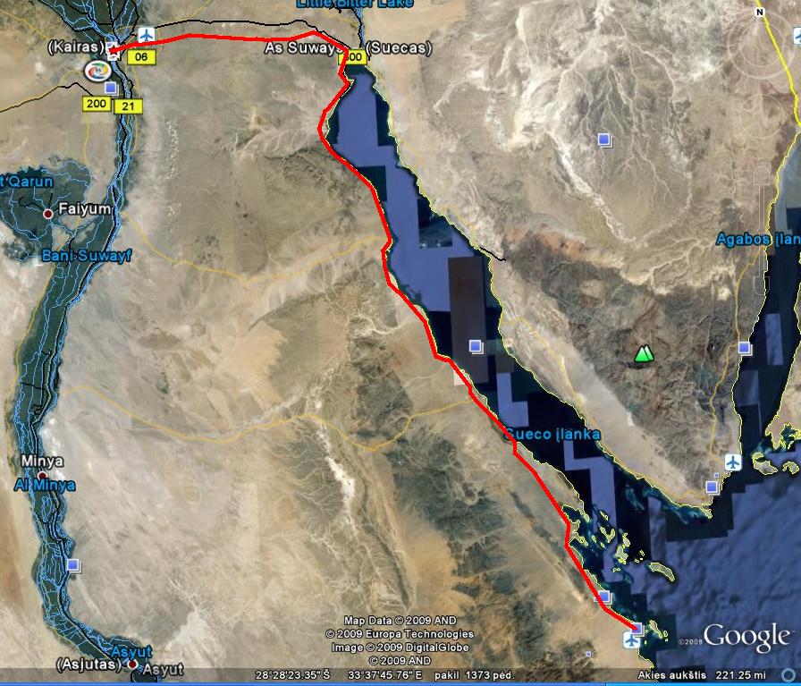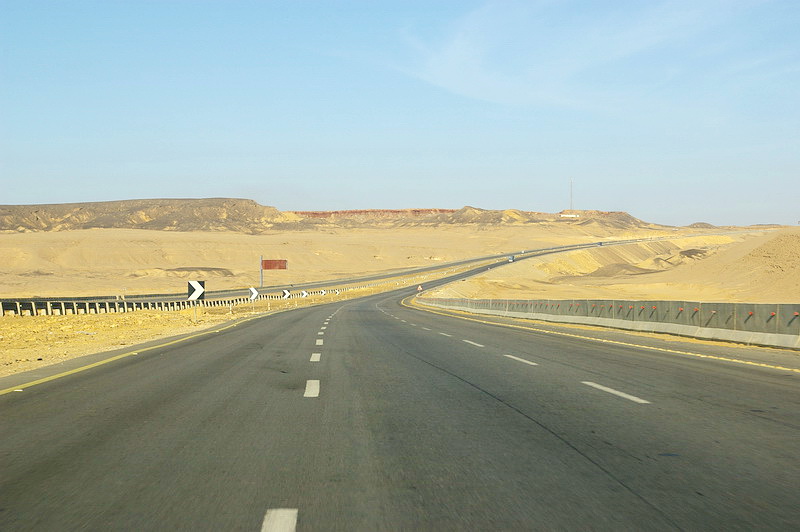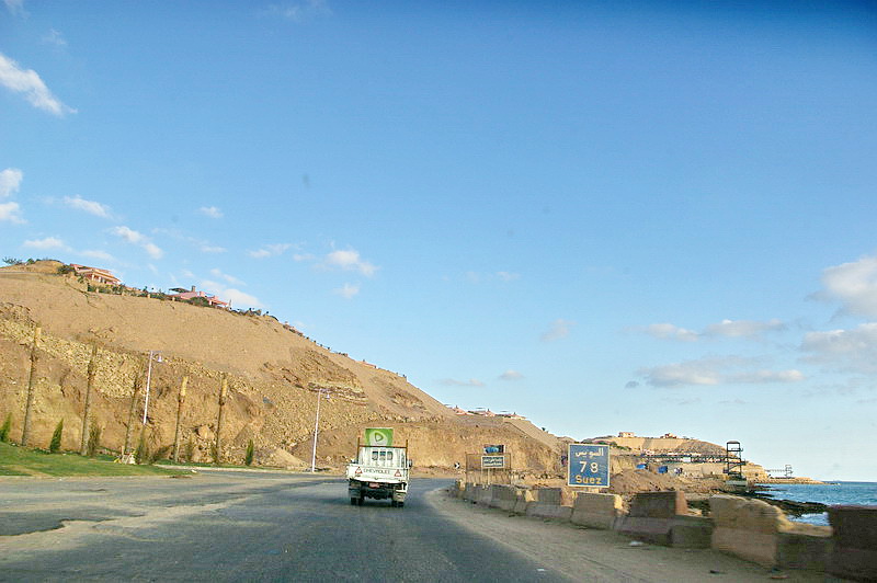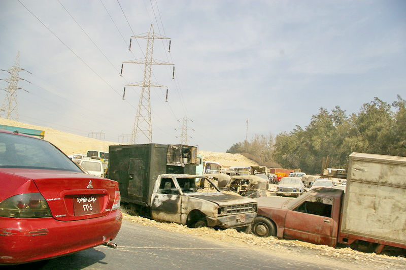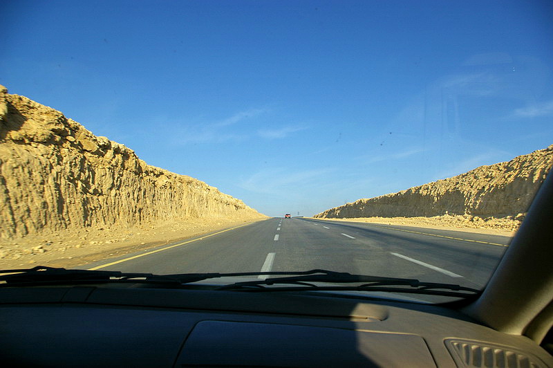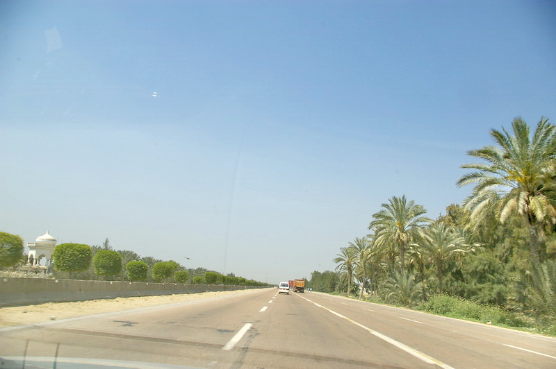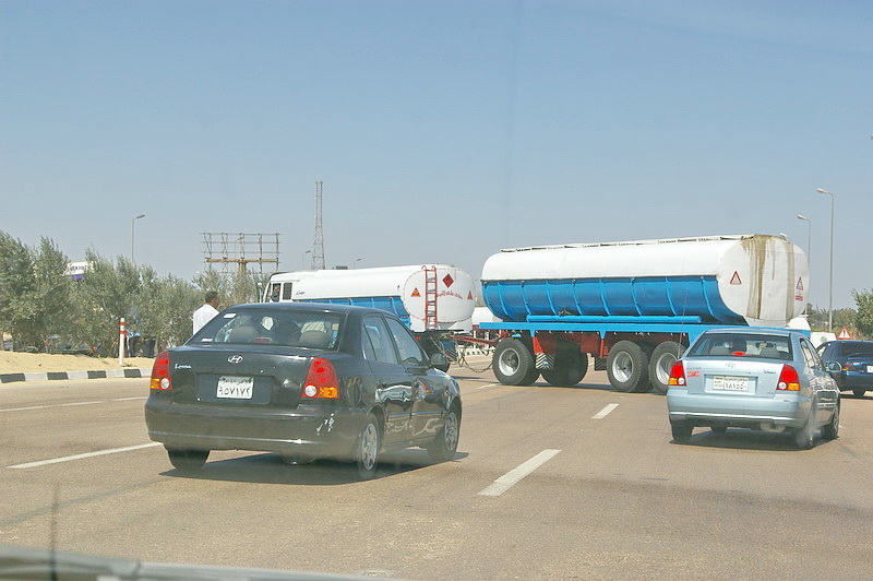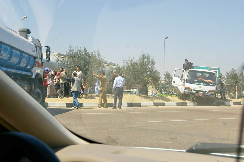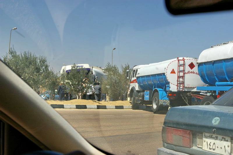 Kalbant apie egiptiečių važiavimą, tai mūsų kelių „šustriakai“ dar nėra pats baisiausias variantas. Egiptiečiai važiuoja ir greitai, ir baisiai. Jų važiavimo stilius autostradoje iš keleivio reikalauja tvirtų nervų – varoma visu greičiu pirmyn, priartėjus prie automobilio priekyje, pablyksima tolimomis šviesomis, kad jis nesugalvotų kokių nors manevrų, pyptelima, kad užtvirtinti sandėrį, o pralenkiant pyptelima dar kartą tipo „ačiū“. Įtampa didžiulė, didžiulės fūros ar cistenos ramiai mina trečiąja autostrados eile. Tačiau avarijų per visą kelią tematėme tik vieną – bet žiaurią. Žemiau patektose nuotraukose skersai trijų eilių autostrados(!) stovinti baltai-mėlyna autocisterna NEpateko į avariją. Į avariją pateko susidauždamos dvi autocistenos priešingoje kryptyje. Kadangi Egipte tokių dalykų kaip ugniagesiai-gelbėtojai nepasitaiko, tai minia sustojusių vairuotojų bando gelbėtis patys. Avarijos metu vienos iš cisternų kabina buvo sulamdyta ir užspaudė vairuotoją, tai ta skersai autostrados stovinti baltai-mėlyna autocisterna, užkabinus trosu, bando atlenkti kabiną. O tuo tarpu pro jos galą iš visų trijų eilių pravažiuoja kiti awto. Scena tik šaltų nervų žmonėms.