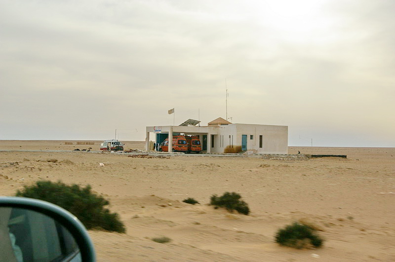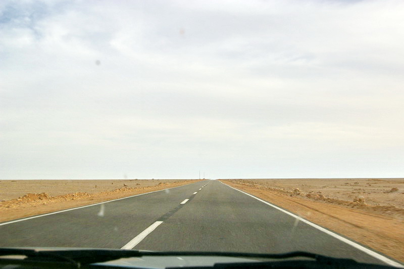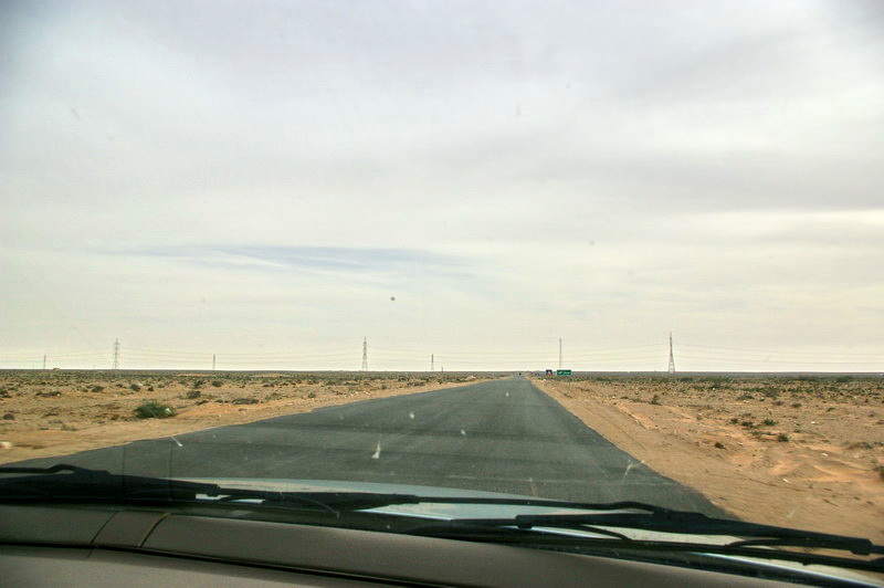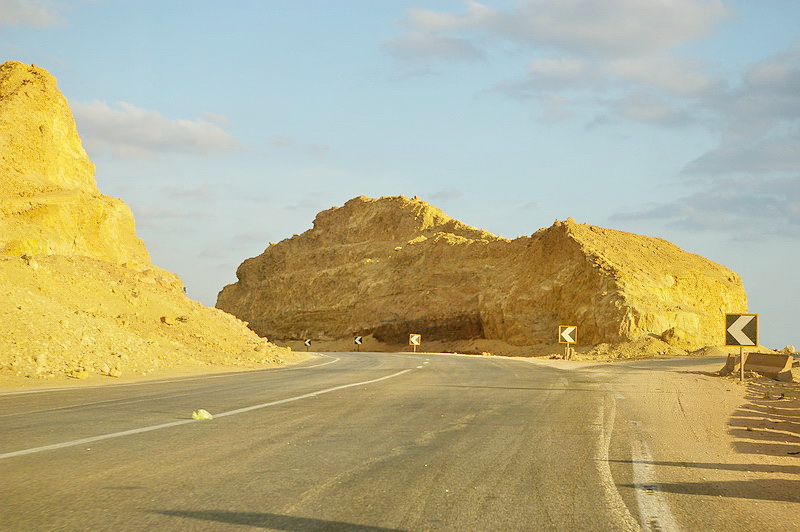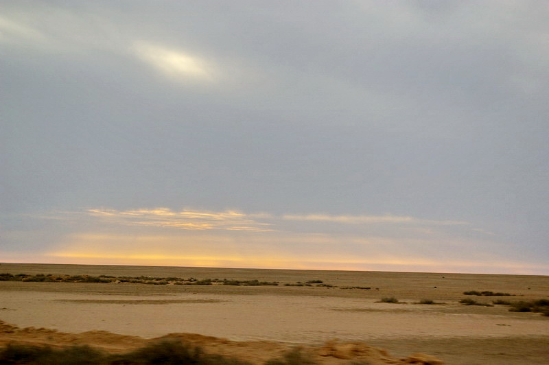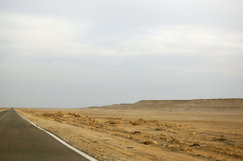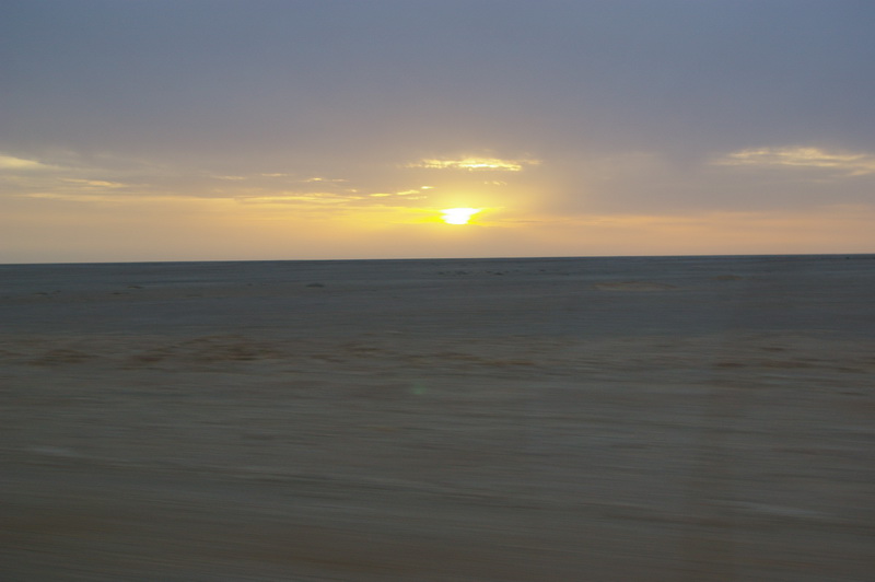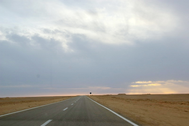Iš Marsi Matrucho pasukome į pietus-pietvakarius, nes Siwa oazė tėra tik 5km nuo Libijos sienos. Mūsų laukė 300km per dykumą. Turiu pasakyti, kad čia dykuma vėlgi nėra Sacharos smėlynai, ji greičiau rupus smėlis perpus su žvyru. Tuoj už Marsi Matrucho kurį laiką dar galima matyti dykumoje gyvenančių beduinų namus, paskui lieka tik dykynė. Peizažą pagyvina mobilių komunikacijų bokštai, kurie yra aptverti plytų tvoromis. Tačiau vos ne kas antro bokšto aptvaras gerokai apardytas, o plytų nėra. Kas ten atvažiuoja į dykumos vidurį tų plytų vogti – nesuprantu. Kitas peizažą pagyvinantis objektas – greitosios pagalbos stotys, kur stovi 1-2 greitosios pagalbos automobiliai. Šiaip vaizdai vietomis gana monotiniški, vietomis matosi yrantys kalnai, tačiau dienos pabaigai buvome apdovanoti nuostabiu saulėlydžiu, kai Saulė nusileido debesin, o per debesies plyšį jos spinduliai sukūrė tarsi prožektoriaus šviesos srautą.