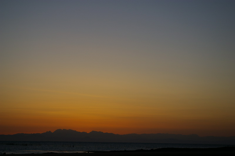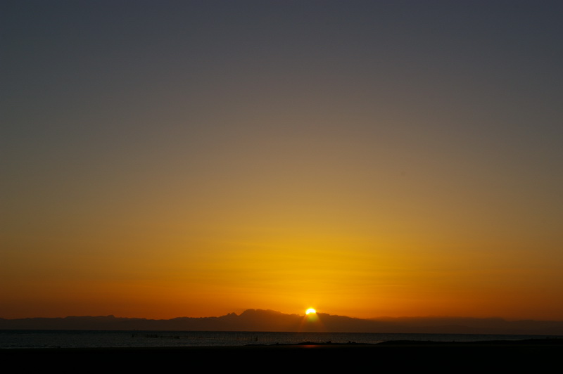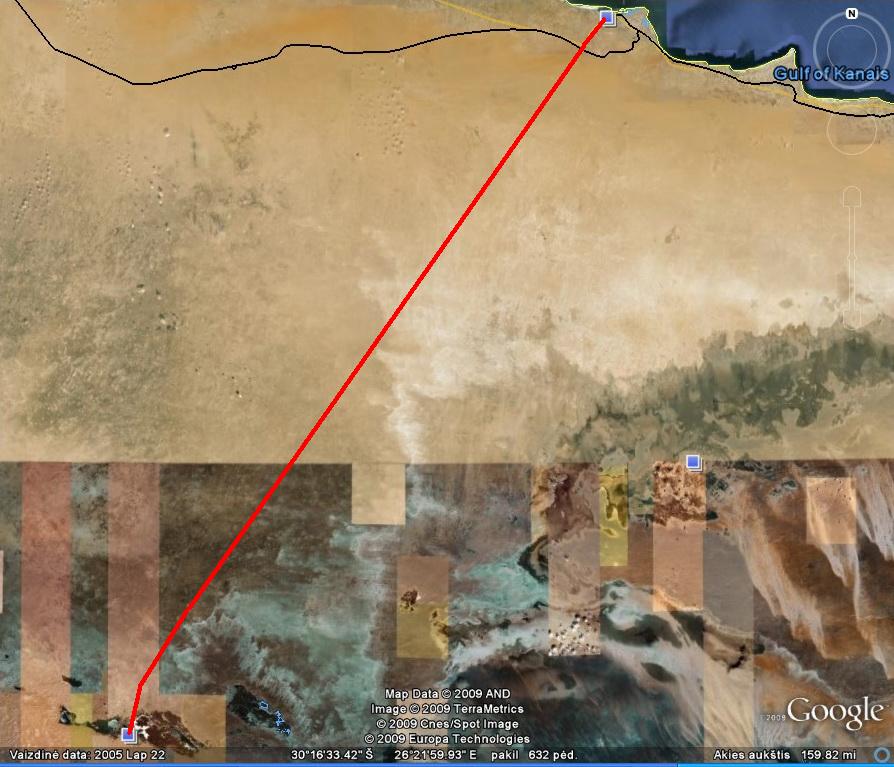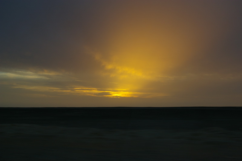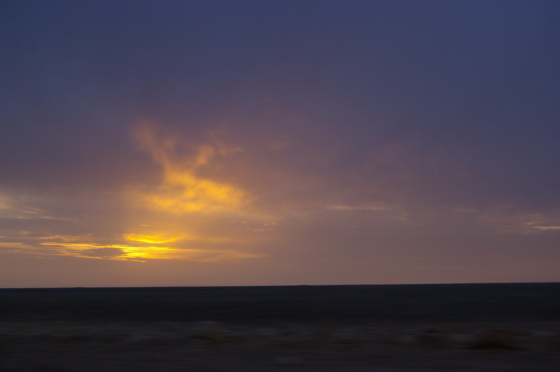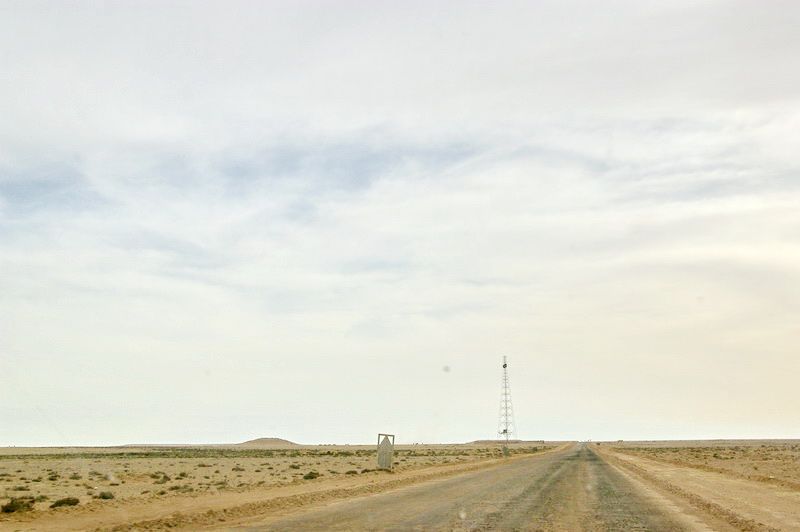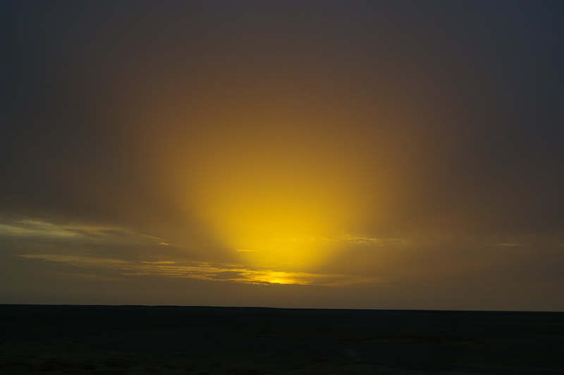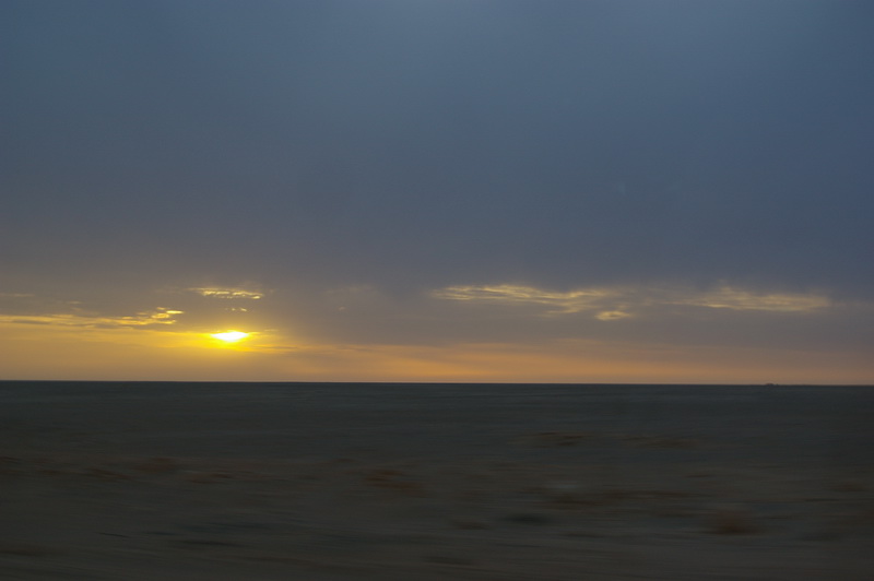 Iš Marsi Matrucho pasukome į pietus-pietvakarius, nes Siwa oazė tėra tik 5km nuo Libijos sienos. Mūsų laukė 300km per dykumą. Turiu pasakyti, kad čia dykuma vėlgi nėra Sacharos smėlynai, ji greičiau rupus smėlis perpus su žvyru. Tuoj už Marsi Matrucho kurį laiką dar galima matyti dykumoje gyvenančių beduinų namus, paskui lieka tik dykynė. Peizažą pagyvina mobilių komunikacijų bokštai, kurie yra aptverti plytų tvoromis. Tačiau vos ne kas antro bokšto aptvaras gerokai apardytas, o plytų nėra. Kas ten atvažiuoja į dykumos vidurį tų plytų vogti – nesuprantu. Kitas peizažą pagyvinantis objektas – greitosios pagalbos stotys, kur stovi 1-2 greitosios pagalbos automobiliai. Šiaip vaizdai vietomis gana monotiniški, vietomis matosi yrantys kalnai, tačiau dienos pabaigai buvome apdovanoti nuostabiu saulėlydžiu, kai Saulė nusileido debesin, o per debesies plyšį jos spinduliai sukūrė tarsi prožektoriaus šviesos srautą.