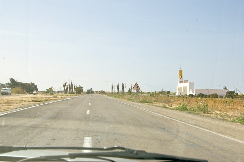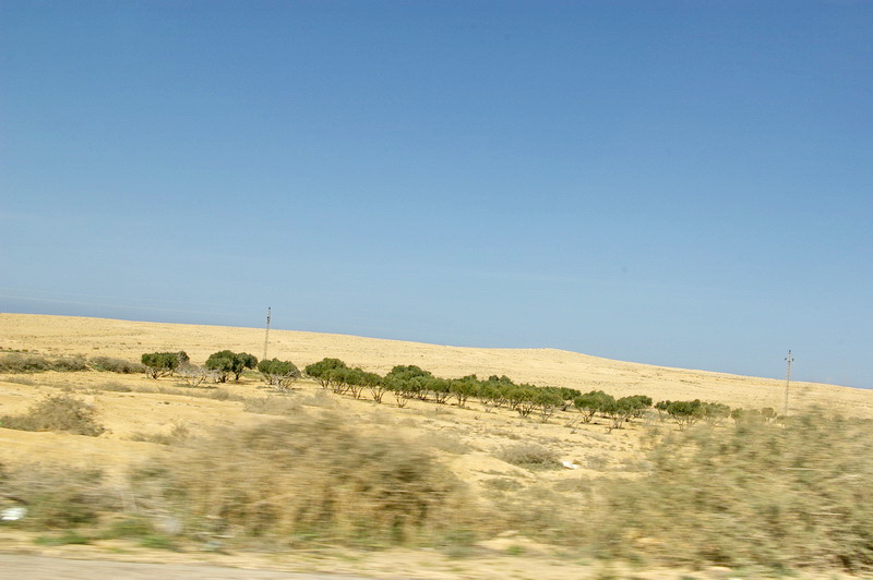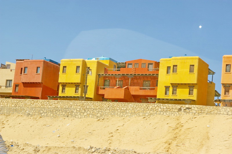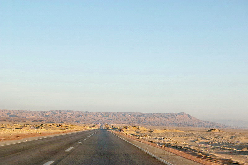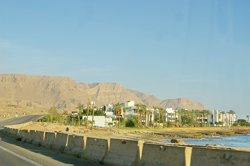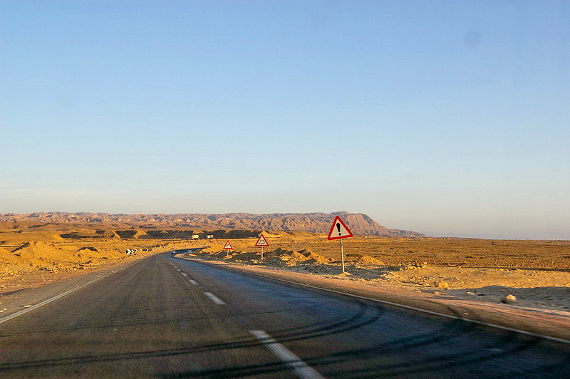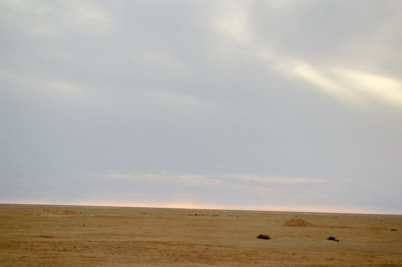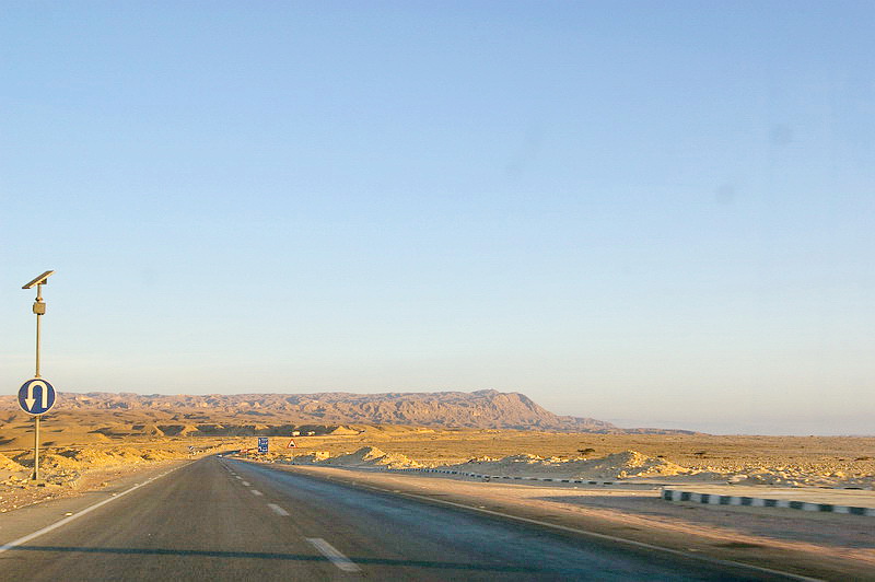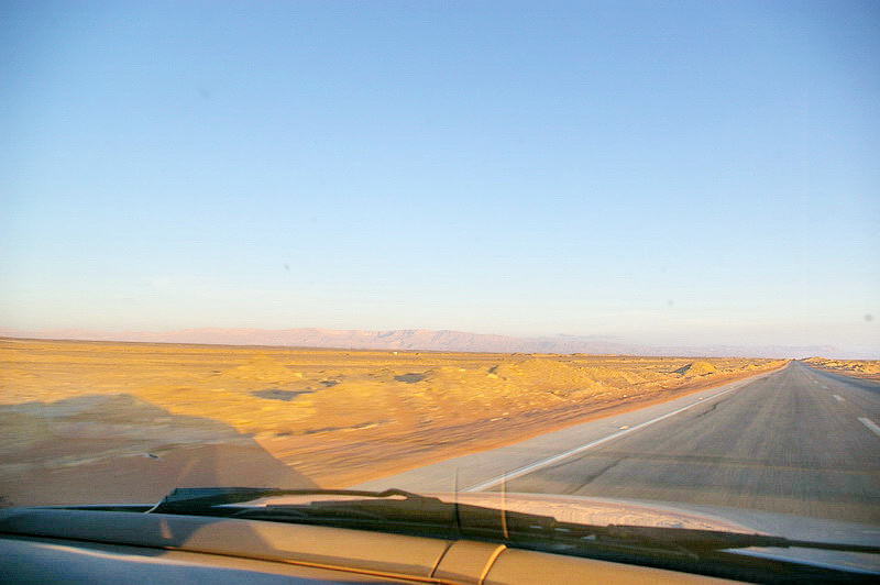 Pasistiprinę numynėme toliau. Kadangi išaušo, buvo galima pasižvalgyti po dykumą, kuri čia kiek kitokia, nei važiuojant Kenos kryptimi. Pakelėje kai kur išsimėtę kurortai – kai kada poros aukštų pastatų ar vilų kompleksai, kai kada milžiniški viešbučiai. Čia, nutaikęs ilgą lygų ir tuščią kelio gabalą, žentas man pademonstravo, ką gali kinų avtropromo stebuklas. Mano brangiausioji, tuo metu prabudusi ant užpakalinės sėdynės, žado netekusi su siaubu stebėjo dviejų durnių džiaugsmą 😉 Galiu pasakyti tik tiek, kad daugiau tokių triukų nebandėme, greitis neviršijo 160-180km/val, ir tai tik gerose atkarpose.