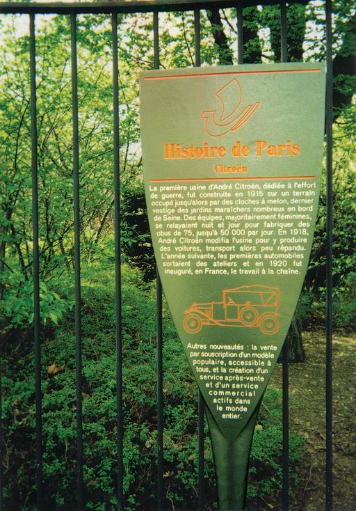 2003ųjų pavasarį nuvažiavau į Paryžių, į komandiruotę. Apart tarnybinių vizitų, savaitgalį apsilankau Parc André Citroën, kuris įkurtas buvusios Citroën Javel gamyklos vietoje. Parko plotas 14has, jame daug žalumos ir vandens įrengimų. Į parką patenkama metro, važiuojant 10 linija Boulougne kryptimi (bilietas 1.30EU) iki stotelės Javel-André Citroën; ten galima patekti ir RER (priemiestiniu traukiniu), važiuojant maršrutru C Versailles kryptimi, sustojimas Javel. Atvažiavus metro, stotyje Javel-André Citroën galima apžiūrėti nedidelę ekspoziciją, skirtą André Citroën veiklai. Išeinama metro traukinio kryptimi - palypėjus laiptais, iš karto holas su dviem durimis. Išėjus į lauką, dešinėje matosi perėja su šviesaforu, gatvė (Quai André Citroën) atskirtų krypčių. Kitoje gatvės pusėje matosi RER stotis Javel. Perėjus per Quai André Citroën, pasukame į kairę, kur vėl yra perėja su šviesaforu. Perėjus ir šią gatvę, einame siauru asfalto taku: iš dešinės tvora, už jos RER bėgiai, iš kairės - pristatyta automobilių gatvė su aptvaru. Už gatvės - didžiulis modernios architektūros daugiabutis namas. Asafalto taku einame apie 5 minutes, prieiname geležinę tvorą su vartais. Prie tvoros pritvirtinta memorialinė André Citroën lenta. Įėjus pro vartus, einame tiesiai ūksminga alėja, kol išeisime į centrinę aikštę. Apie ją išsidėstę šiltnamiai, vandens įrenginiai, rekreacinės zonos. Parke pilna energingai sportuojančių ar ramiai vaikštančių prancūzų. Parke yra tiek kruopščiai prižiūrimų želdinių, tiek laisvai augančių bambukų sąžalynų, daugybė retų rūšių augalų.