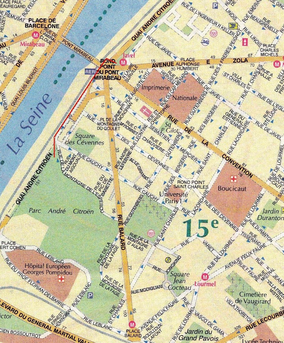 Parc André Citroën prieigų planas su raudonai pažymėtu keliu ligi jo |